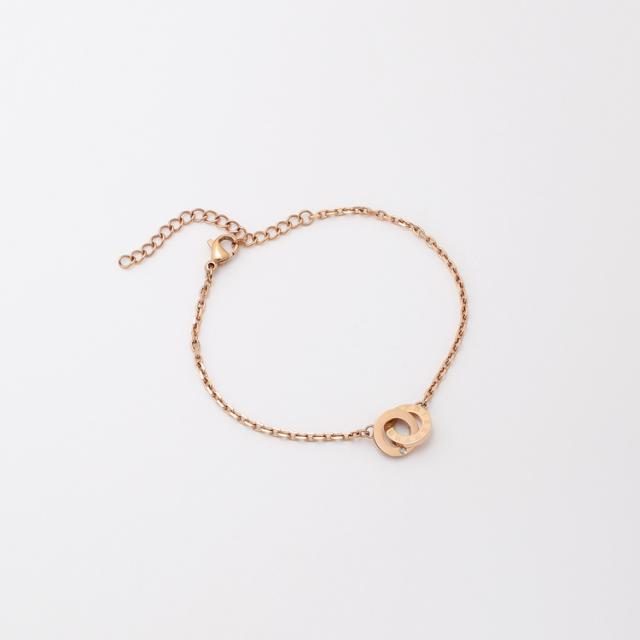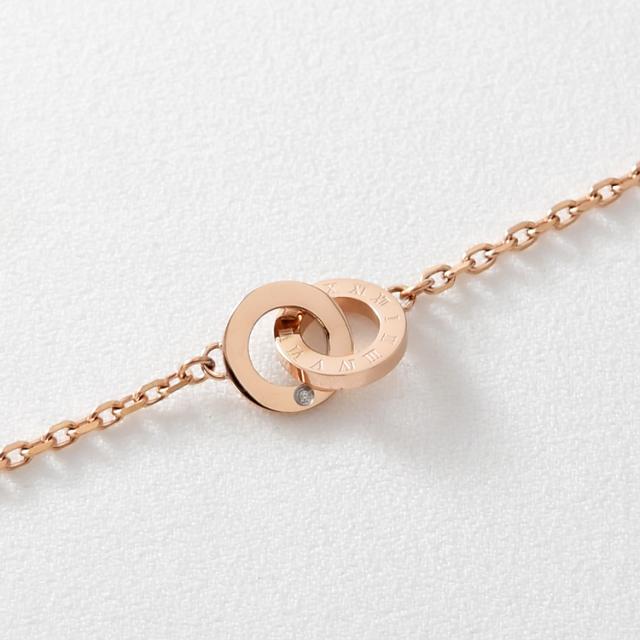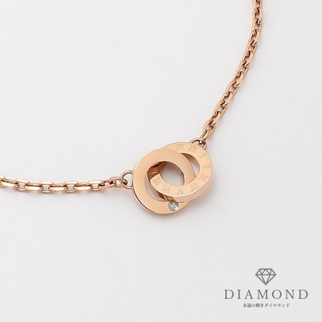 ローマ数字が刻まれたリングとダイヤモンドをあしらったリングが繋がる、インターロッキングデザインのブレスレット。 裏面には名入れ刻印が可能です。ローズゴールドカラー。
