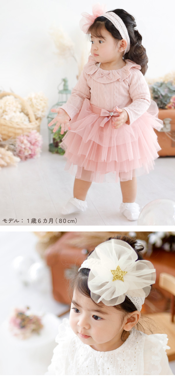 | サイズ:商品 | ・チュチュスカート(80cm:〜1歳半頃) ・ヘアバンド(約38〜47cm:2か月〜2歳頃) ・ソックス(10〜12cm:6か月〜1歳頃) ・フットバンド(9~11cm :6か月〜1歳半頃) ・マンスリーカード(はがきサイズ100mm×148mm) |