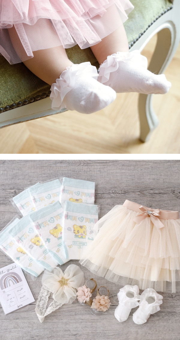 赤ちゃん用のおむつに、女の子の憧れチュチュスカート・ヘアバンド・フリルソックス・フットバンドを詰め合わせました。普段使いはもちろん、誕生日やハーフバースデー、100日、お食い初め、あらゆるイベントに大活躍。