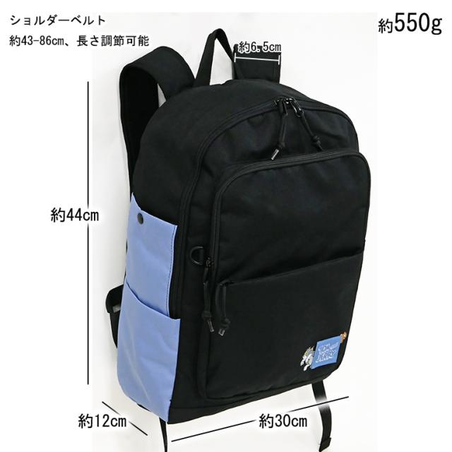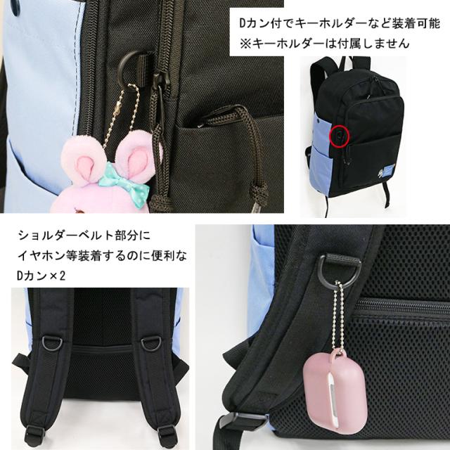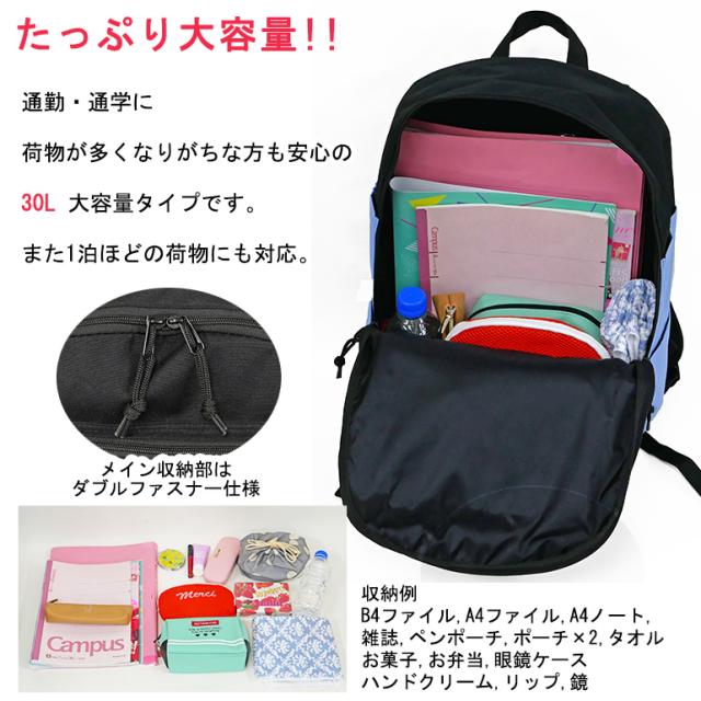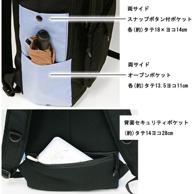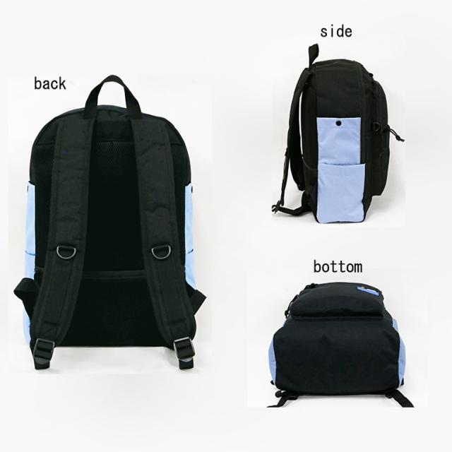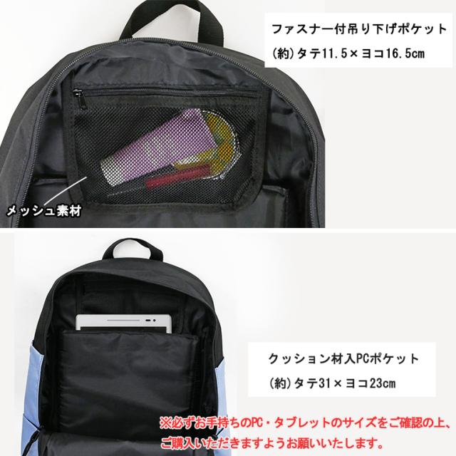 B4ファイルが入る大きめサイズのリュック。 ノートPCやタブレットを入れられるクッションポケットを内蔵。 前面や背面など、ポケットも充実したスクールにぴったりのバッグです。