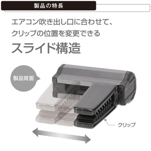 クリップは360°回転するので、あらゆる形状のエアコンフィンに対応。