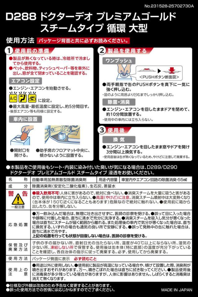 消臭剤 ドクターデオ プレミアムゴールド スチームタイプ 循環 大型 無香料 車用 除菌 消臭 ウイルス除去 カーメイト D288