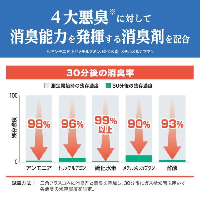 4大悪臭※に対して、90%以上の高い消臭能力を発揮する消臭剤を配合しています。