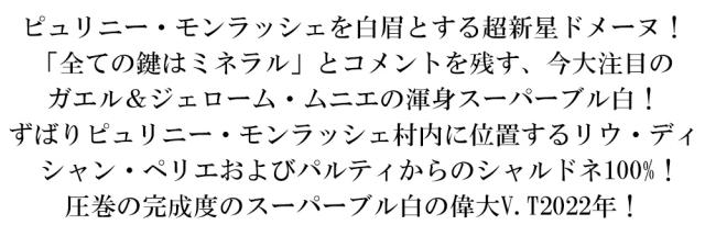 ピュリニー・モンラッシェを白眉とする超新星ドメーヌ! 「全ての鍵はミネラル」とコメントを残す、今大注目の ガエル&ジェローム・ムニエの渾身スーパーブル白! ずばりピュリニー・モンラッシェ村内に位置するリウ・ディ シャン・ペリエおよびパルティからのシャルドネ100%! 圧巻の完成度のスーパーブル白の偉大V.T2022年!