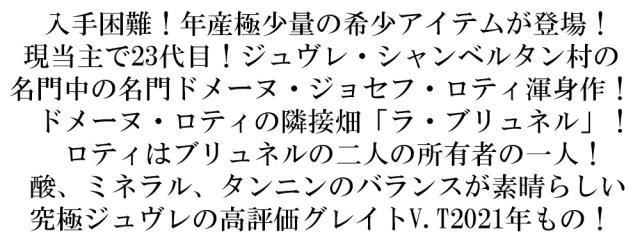 入手困難!年産極少量の希少アイテムが登場! 現当主で23代目!ジュヴレ・シャンベルタン村の 名門中の名門ドメーヌ・ジョセフ・ロティ渾身作! ドメーヌ・ロティの隣接畑「ラ・ブリュネル」! ロティはブリュネルの二人の所有者の一人! 酸、ミネラル、タンニンのバランスが素晴らしい 究極ジュヴレの高評価グレイトV.T2021年もの!
