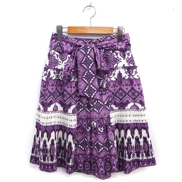 【中古】フラジール FRAGILE スカート フレア ひざ丈 プリーツ リボン ダマスク柄 サイドジップ 36 紫 パープル /NT13