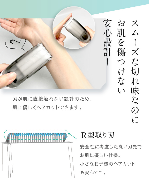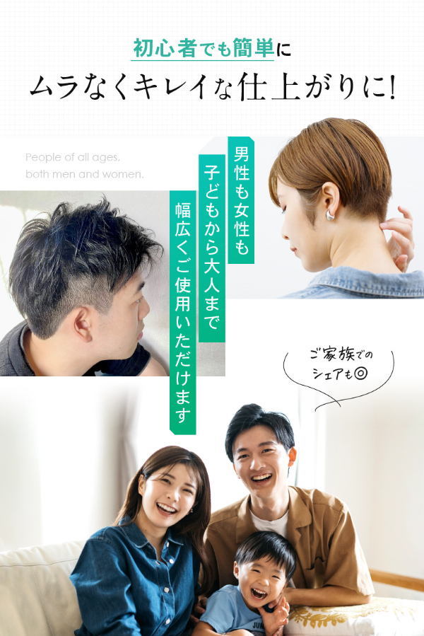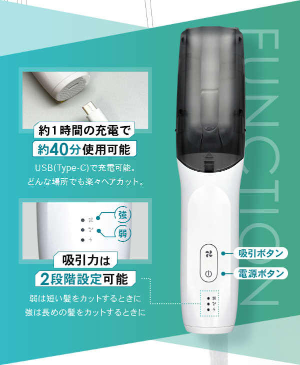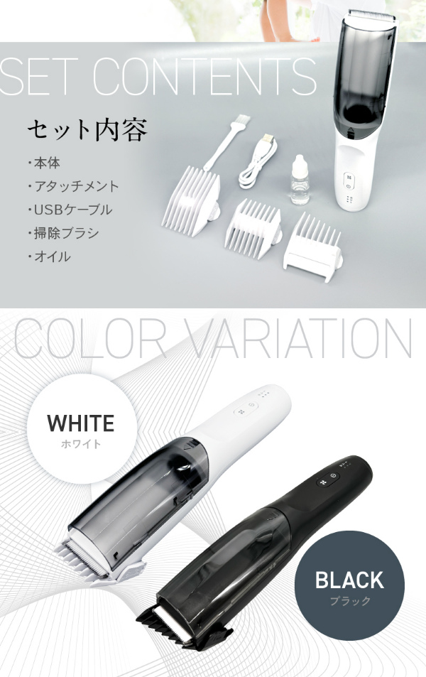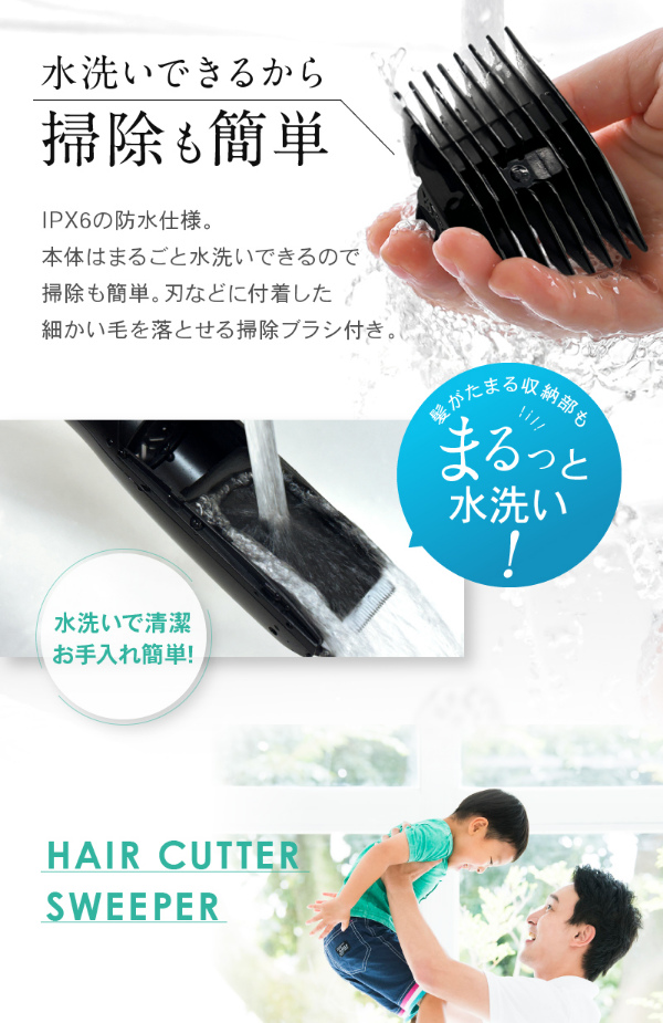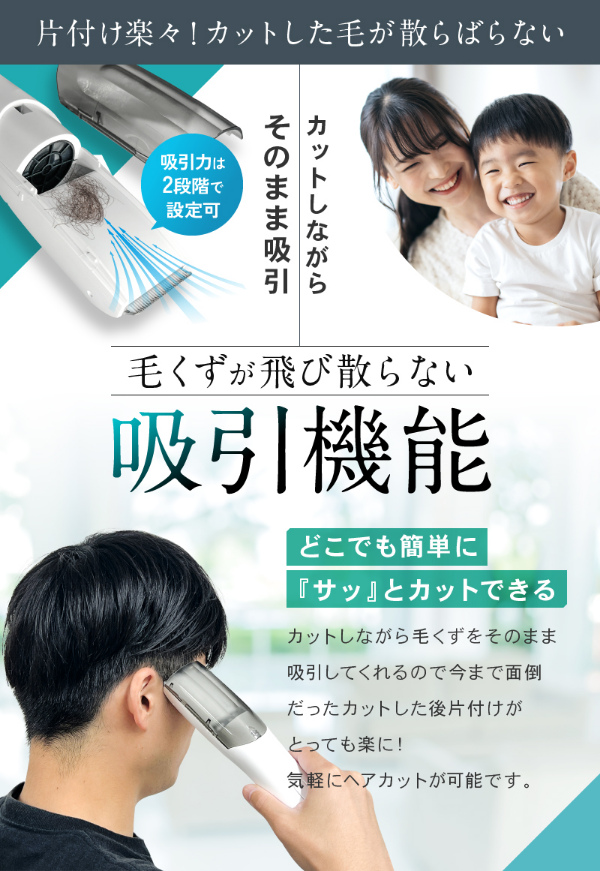 どこでも簡単に「サッ」とセルフカットできる、毛くずが散らばらない吸引電動式バリカンです。ヘアカットしながら毛くずをそのまま吸引してくれるので、今まで面倒だったカットした後片付けがとっても楽に。アタッチメントを変更することで耳周りのカット(1mm/ツーブロック)、短めのカット(3/6mm)、長めのカット(9/12mm)など希望のヘアデザインも簡単に!切れ味の鋭いステンレス刃を採用。柔らかい毛から硬い毛まで誰でも簡単にヘアカット可能。刃が肌に直接触れない設計のため、肌に優しくヘアカットできます。安全性に考慮した丸い刃先でお肌に優しい仕様。小さなお子様のヘアカットも安心です。男性も女性も子どもから大人まで幅広くご使用いただけます。ご家族でのシェアも◎IPX6の防水仕様。髪がたまる収納部もまるっと水洗い!本体はまるごと水洗いできるので掃除も簡単。刃などに付着した細かい毛を落とせる掃除ブラシ付き。