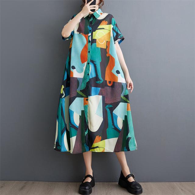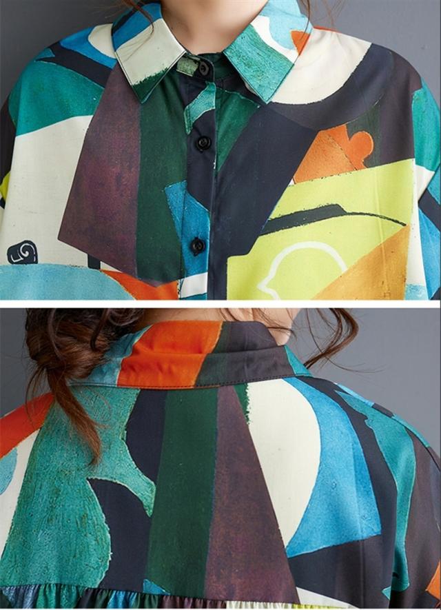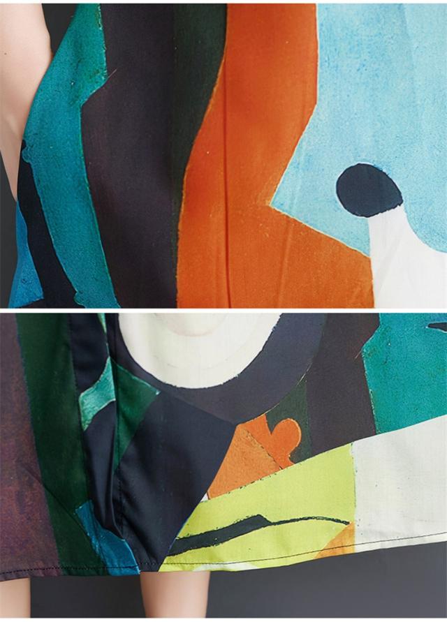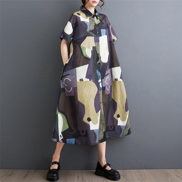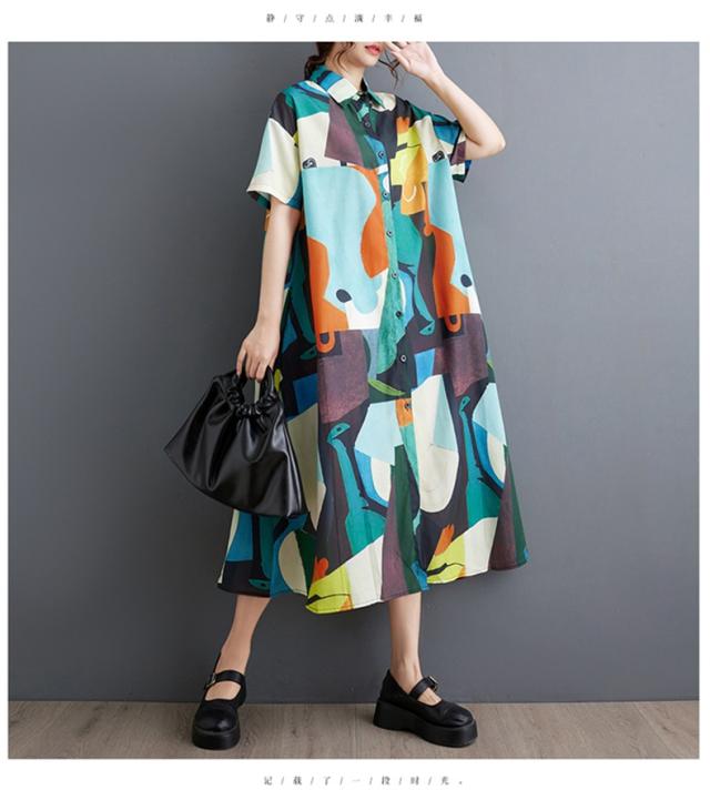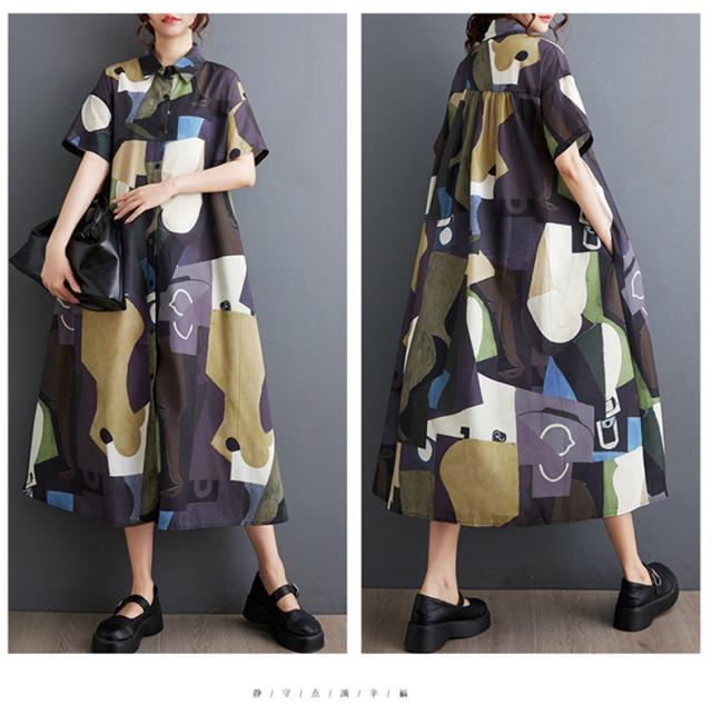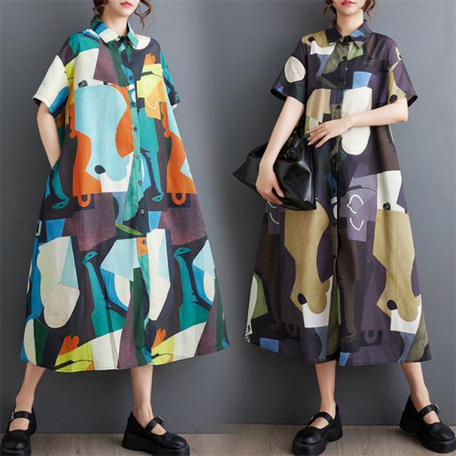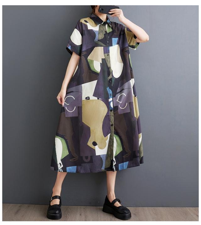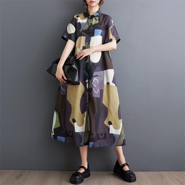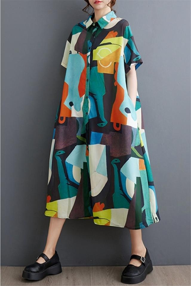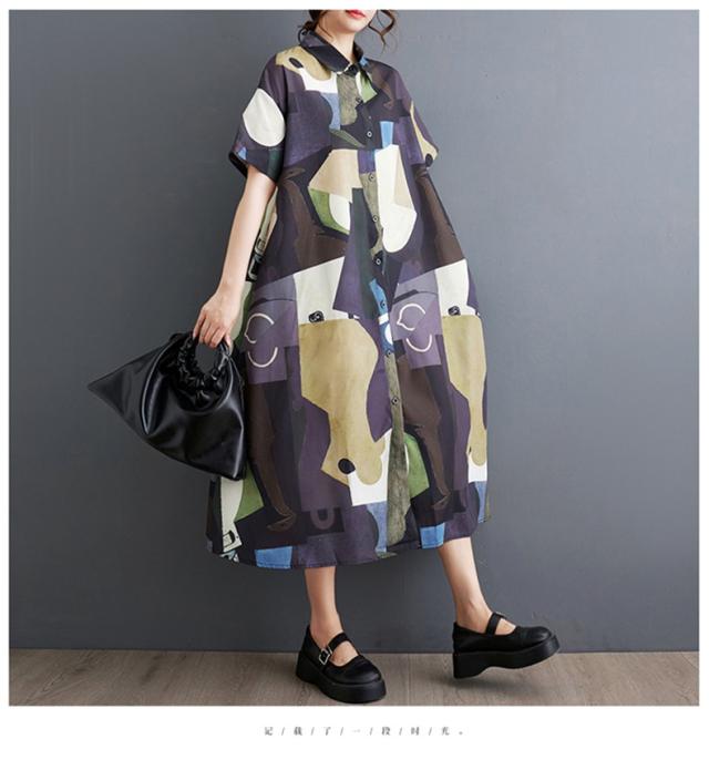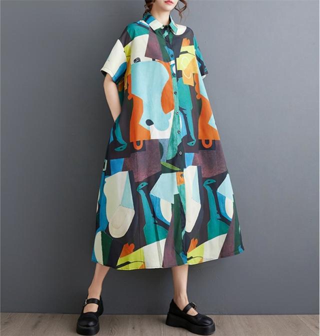 夏ワンピース レディース ロングワンピース 膝下 半袖 抽象柄 個性的 シャツワンピース ゆったりとした着心地 大人カジュアルでこなれ感満点 きれいめ
