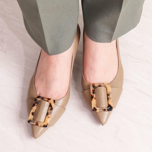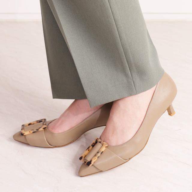・四角いバックルが端正な雰囲気を醸し出すパンプス。