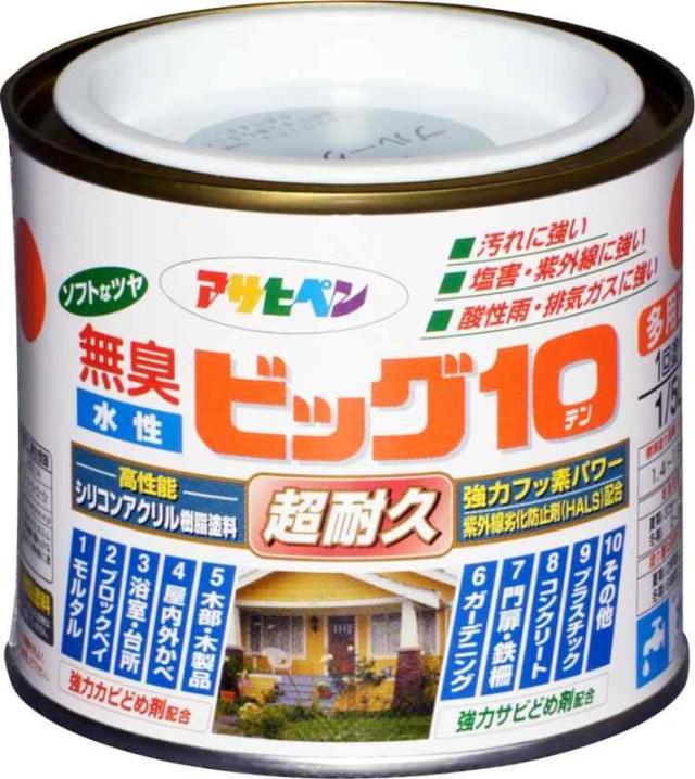 アサヒペン 塗料 ペンキ 水性ビッグ10多用途 1/5L 224ブルーグレー 水性 多用途 半ツヤ ソフトなツヤ 1回塗り 超耐久 無臭 特殊フッ素樹脂配合 防カビ サビドメ剤配合 紫外線劣化防止剤配合 シックハウス対策品 日本製