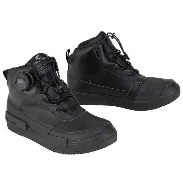 ストリートファッションに合うスニーカーのようなデザインながら、防水性能やプロテクターなどライディングに必要な機能を兼ね備えたライディングシューズ。アッパー内部にはTAICHIオリジナルの防水・透湿素材”ドライマスター”を採用し、全天候での使用に対応。着脱のしやすさと優れたフィット感を実現するBOA?フィットシステムを採用。くるぶしまで覆うハイカットタイプで、転倒時でもシューズが脱げにくい仕様に。シューズ内外に配置されたプロテクターが足への衝撃を軽減します。
