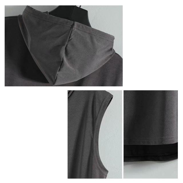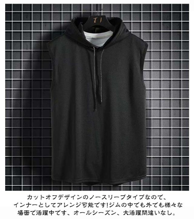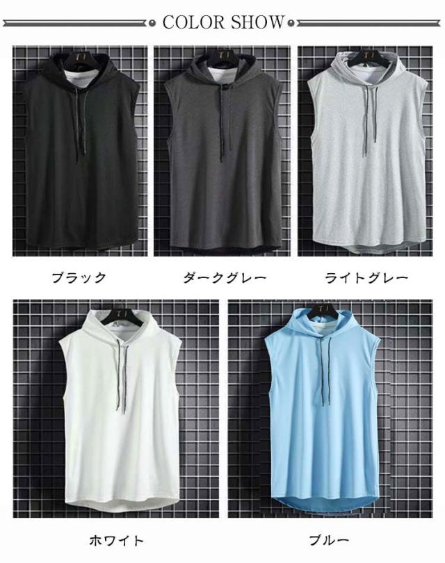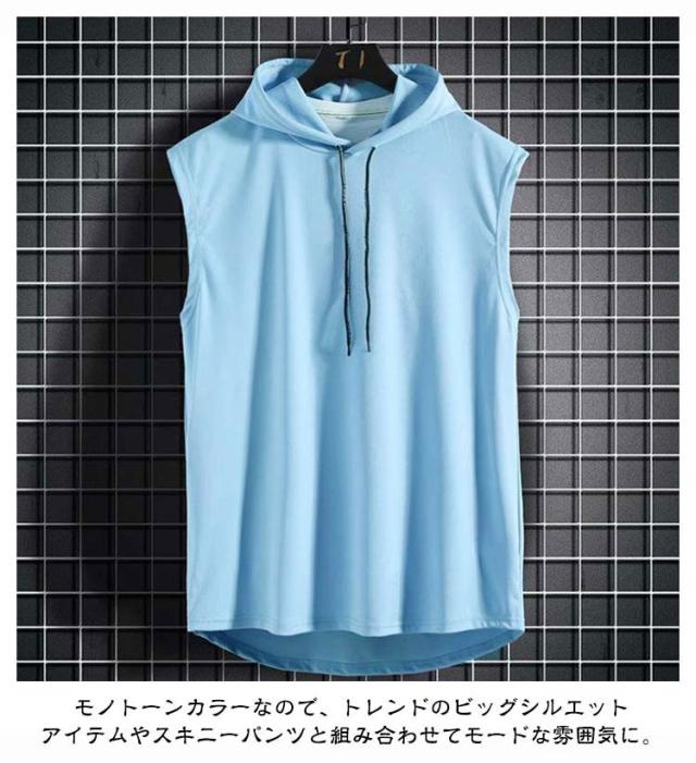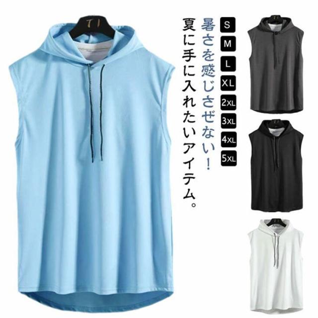 タンクトップ メンズ 接触冷感 速乾 ストレッチ トップス フード付き ストレッチ トレーニング 超伸縮 薄手 無地 プルオーバーパーカー ジャージ 上 ノースリーブパーカー スポーツウェア 袖なしパーカー カットソー 筋トレ サッカー 運動 夏服 父の日 送料無料