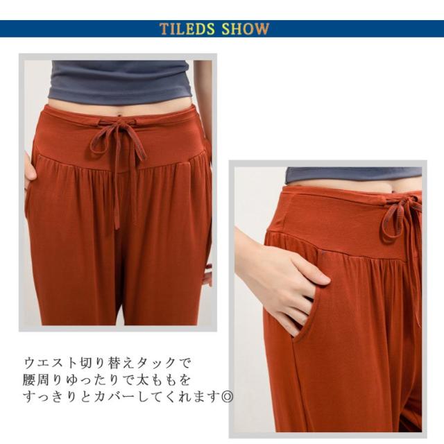 | 全5色×5サイズ!ゆるい落ち感が好評で絶妙シルエットのサルエルクパンツ。 ヨガやフィットネスにはもちろん、リラックス部屋着やちょっとしたお出かけにも使える! ウエスト切り替えタックで腰周りゆったりで太ももをすっきりとカバーしてくれます◎ とろみ感のあるモダール素材を採用して、吸汗性に優れて、いつも素肌感覚の柔らかい着心地を実現。 しわにもなりにくく、すぐに乾くことも人気の秘密。 薄めでよく伸びるストレッチタイプでサラサラ軽い肌さわりです。 長時間の移動や立ったり座ったりする作業の多い日は、履き心地の気持ちいいこちらのパンツがおすすめ! | |