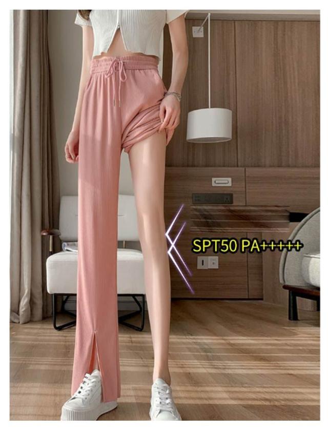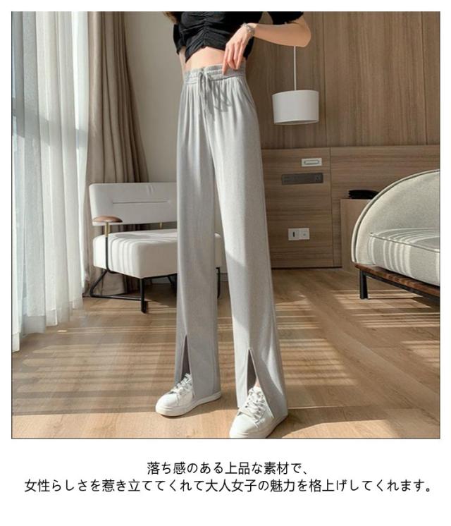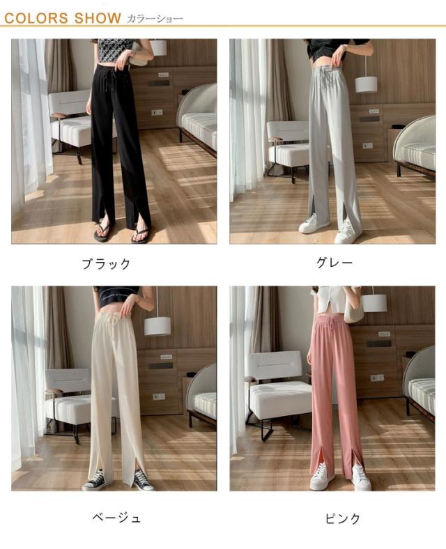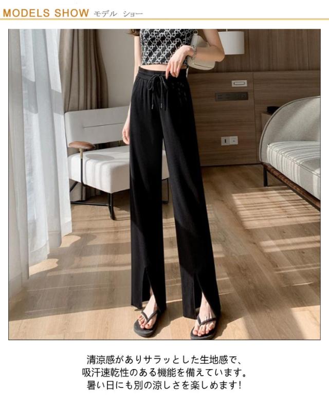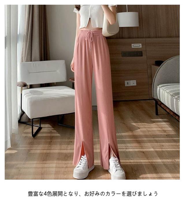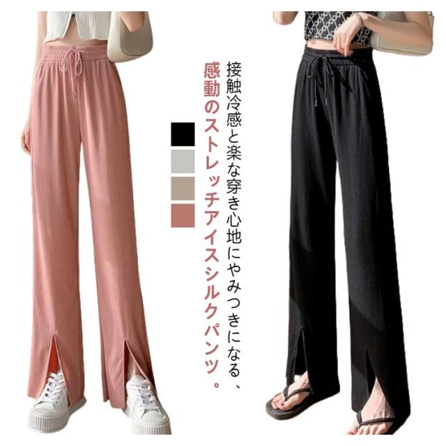 レディース イージーワイドパンツ 薄手 春夏 ウエストゴム UVカット ボトムス リブ 光沢感 パンツ ロングパンツ 切れるパンツ プリーツパンツ 夏 伸縮性抜群 リラックス おしゃれ UVカット カジュアル 涼感 涼しい 部屋着 体型カバー