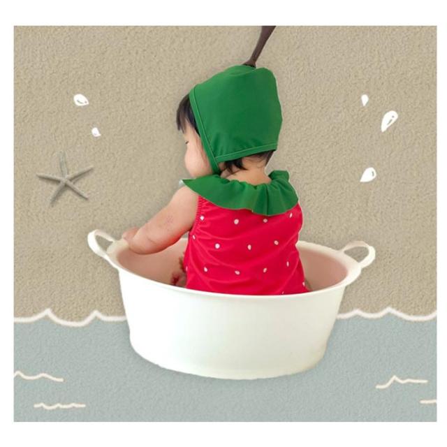 | 可愛いフルーツ柄のベビー水着。 キャップ付きでお子様を日焼けから守ることもできます。 プールや海で目立ちそうな柄アイテムで子供らしさ満載。 小さなお子さんの肌への負担が心配なお母さんんもこれなら安心ですね。 自宅での水遊びなどで初めての水遊びを安心して楽しむことができますね。 | |