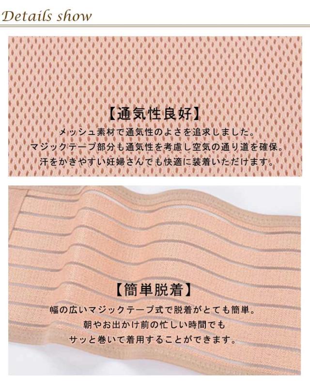 | 【お腹をしっかりサポート】 妊娠中の骨盤の緩みを緩和し、大きなお腹や腰をサポートしてくれるマタニティ骨盤ベルト。 お腹の部分は伸縮性のある素材を使用し、お腹を優しく包み込みフィット感も抜群!通気性にもすぐれ使用中のムレを防いで快適な着用感♪ 【簡単脱着】 幅の広いマジックテープ式で脱着がとても簡単。朝やお出かけ前の忙しい時間でもサッと巻いて着用することができます。 【サイズ調整】 マジックテープ式で、ご自分にあったサイズに調整できます。お腹の成長に合わせ締めつけ具合を調節。伸縮性のある素材で、お腹の丸みにしっかりフィットします。 【通気性良好】 メッシュ素材で通気性のよさを追求しました。マジックテープ部分も通気性を考慮し空気の通り道を確保。汗をかきやすい妊婦さんでも快適に装着いただけます。 | |