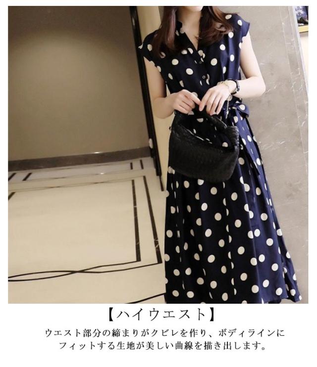 シャツワンピース ベルト付き レディース ワンピース フレンチスリーブ Aライン ロングワンピース ドレス 膝丈 シフォン ドット柄 ハイウエスト ドット柄 ワンピ キレイめ レトロ お呼ばれ 通勤 通学