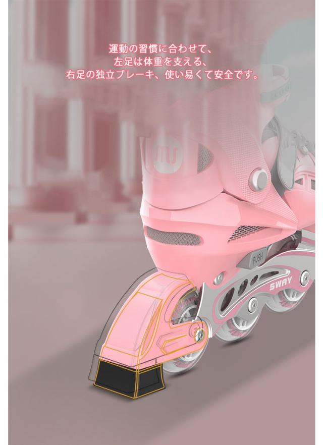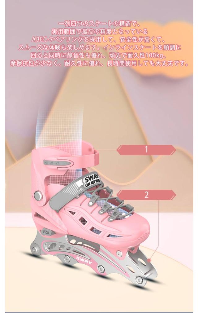 | 【光るホイール&右足ブレーキ】 三重プロテクションシステム、標準的な安全バックル&マジックテープ&靴ひもがあり、厚みのあるクッションが痛い靴擦れや衝撃から足首を守り、安全性と快適さを保ちます。 充電不要のホイールが回るとキラキラと光る★滑るときにピカピカと光ってカッコイイ! 運動の習慣に合わせて、左足は体重を支える、右足の独立ブレーキ、使い易くて安全です。 【安定性と静音性と耐久性】 インラインスケートの表面高強度衝突の対策を講じ、衝撃吸収材を使用し、振動を防ぎ安定感があります。安全性と快適さを確保します。 一列四つのスケートの構造で、実用範囲で最高の精度となっているABEC-7ベアリングを採用して、安全性が高くて、スムーズな体験も楽しめます。インラインスケートを順調に回ると同時に静音性も優れ、頑丈で耐久性100kg、摩擦抗性が少なく、耐久性に優れ、長時間使用しても大丈夫です。 通気性抜群で軽くて良い履き心地をお楽しみください。長時間練習しても、足首には負担がかかりません。 【子供から大人まで】 インラインスケートはあらゆる年齢の子供たちに愛されており、大人にとっても楽しいことです。 また、学校、会社への往復の移動手段としても使用できます。男女を問わず、学生から社会人まで、あらゆる方も楽しめます。広場、公園などの広い場所で簡単に有酸素運動ができますよ。プレゼントにもおすすめなインラインスケートです。 | |
