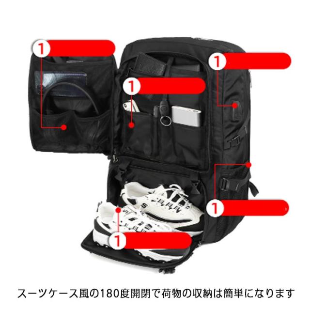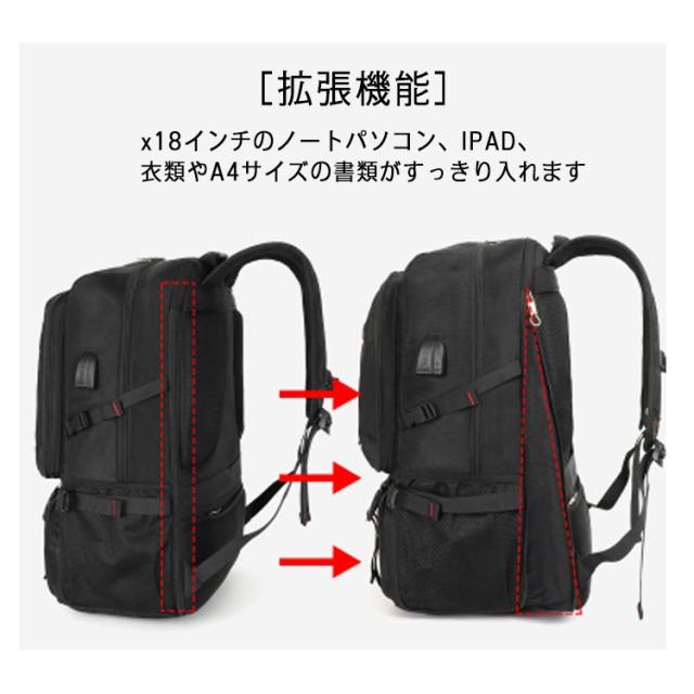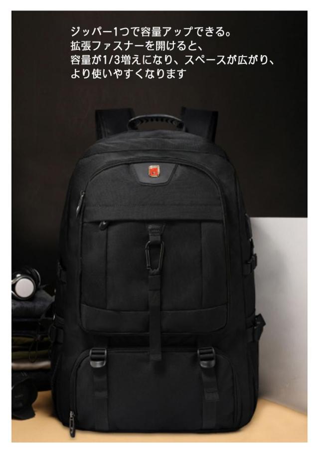 | 機能性抜群リュック 80L 仕分けやすい複数ポケット小物収納ポケット スーツケースに取り付ける スーツケース風の180度開閉で荷物の収納は簡単になります リュックのサイドに付いているUSBポートとイヤホンポート [拡張機能]18インチのノートパソコン、IPAD、衣類やA4サイズの書類がすっきり入れます 急な雨にも安心防水仕様 ジッパー1つで容量アップできる。拡張ファスナーを開けると、容量が1/3増えになり、スペースが広がり、より使いやすくなります | |