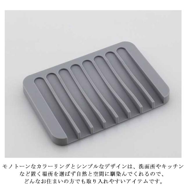 | 石けんの水気をしっかり切ってくれる水が溜まらない石けん置き。 石けんがしめりにくいので、溶けにくく、長持ちしてとっても経済的です。 板状の形に凸凹の溝を作ることで、石鹸へ触れる部分を極力少なく。凹部分は斜めになっているので水を即座に流し、水捨ての手間もいりません。 洗面台のフチに掛けておくと、溜まった水滴を自然に排水するので、濡れた石けんも早く乾きます。 撥水性が高く柔軟性もあるシリコン製、錆や破損などを気にせずまるっと洗えてお手入れも簡単なんです。 モノトーンなカラーリングとシンプルなデザインは、洗面所やキッチンなど置く場所を選ばず自然と空間に馴染んでくれるので、 どんなお住まいの方でも取り入れやすいアイテムです。 | |