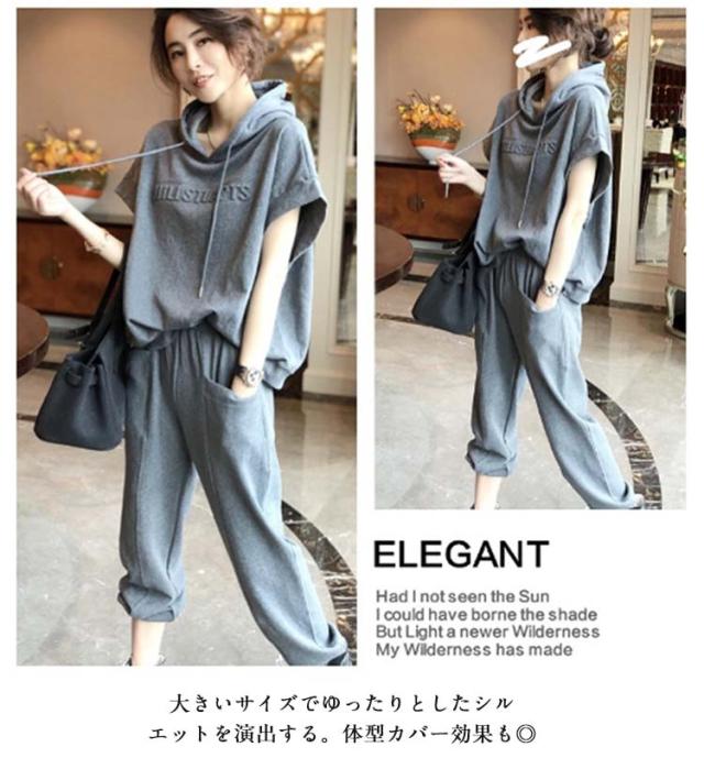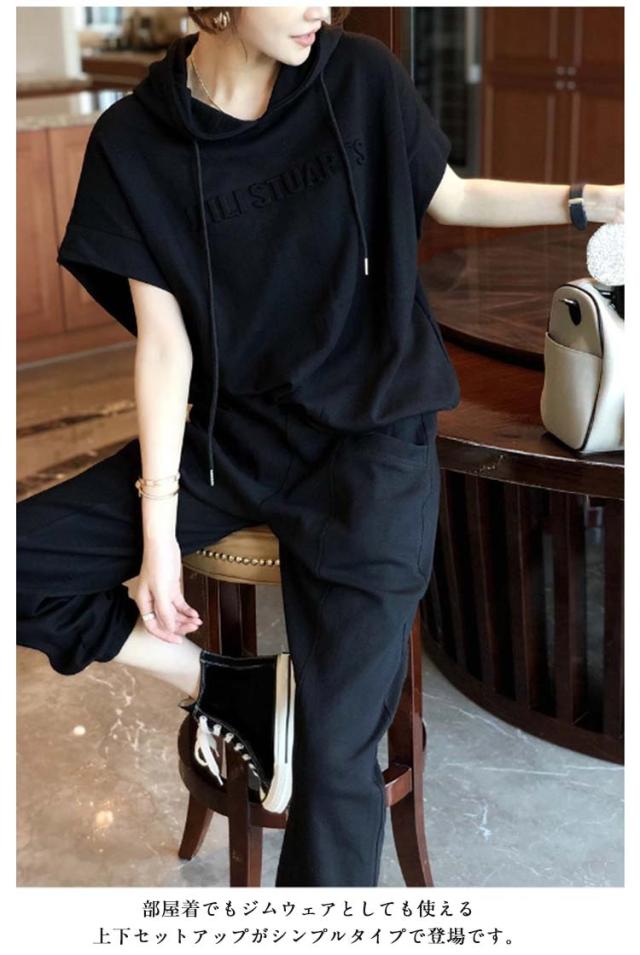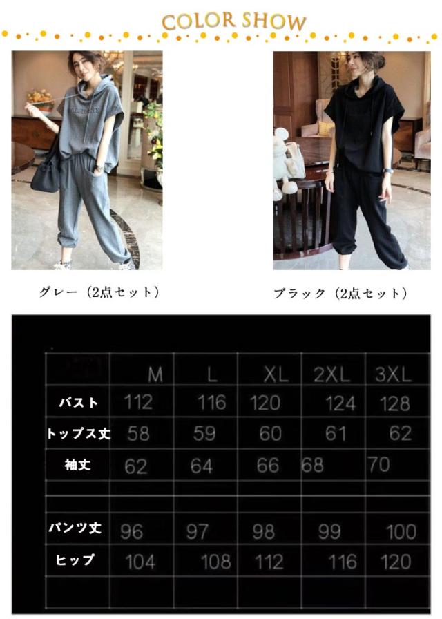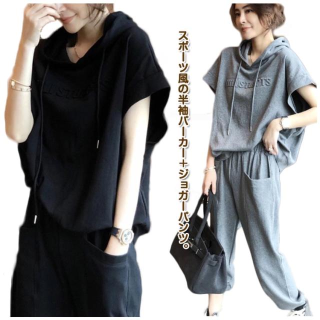 | スポーツ風の半袖パーカー+ジョガーパンツ。 部屋着でもジムウェアとしても使える上下セットアップがシンプルタイプで登場です。 通気性も良く、圧迫感もなく、履き心地も抜群です。 大きいサイズでゆったりとしたシルエットを演出する。体型カバー効果も◎ | |