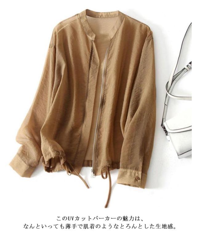 | お洒落感度が高まるロングシアーブルゾン 輝きを秘めた透け感ブルゾンで、狙いすました明るい肌へ このUVカットパーカーの魅力は、なんといっても薄手で肌着のようなとろんとした生地感。暑い時期にもさらりと軽く涼しく着られます。さらに長めのお袖で手首もしっかりと覆えます。 | |