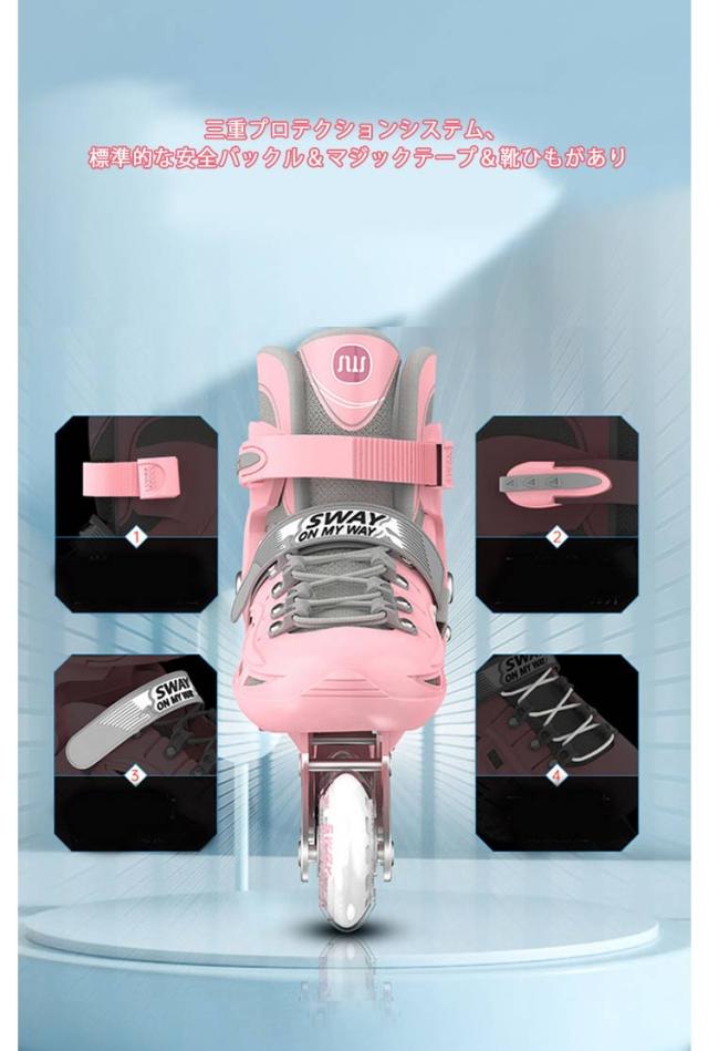 | 【光るホイール&右足ブレーキ】 三重プロテクションシステム、標準的な安全バックル&マジックテープ&靴ひもがあり、厚みのあるクッションが痛い靴擦れや衝撃から足首を守り、安全性と快適さを保ちます。 充電不要のホイールが回るとキラキラと光る★滑るときにピカピカと光ってカッコイイ! 運動の習慣に合わせて、左足は体重を支える、右足の独立ブレーキ、使い易くて安全です。 【安定性と静音性と耐久性】 インラインスケートの表面高強度衝突の対策を講じ、衝撃吸収材を使用し、振動を防ぎ安定感があります。安全性と快適さを確保します。 一列四つのスケートの構造で、実用範囲で最高の精度となっているABEC-7ベアリングを採用して、安全性が高くて、スムーズな体験も楽しめます。インラインスケートを順調に回ると同時に静音性も優れ、頑丈で耐久性100kg、摩擦抗性が少なく、耐久性に優れ、長時間使用しても大丈夫です。 通気性抜群で軽くて良い履き心地をお楽しみください。長時間練習しても、足首には負担がかかりません。 【子供から大人まで】 インラインスケートはあらゆる年齢の子供たちに愛されており、大人にとっても楽しいことです。 また、学校、会社への往復の移動手段としても使用できます。男女を問わず、学生から社会人まで、あらゆる方も楽しめます。広場、公園などの広い場所で簡単に有酸素運動ができますよ。プレゼントにもおすすめなインラインスケートです。 | |