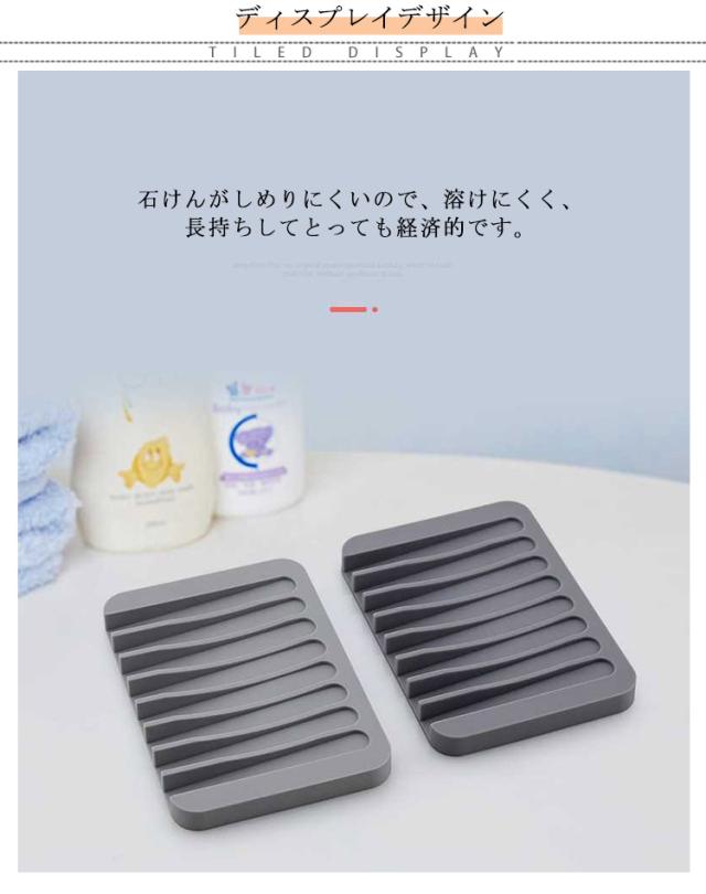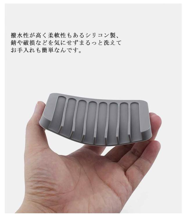 | 石けんの水気をしっかり切ってくれる水が溜まらない石けん置き。 石けんがしめりにくいので、溶けにくく、長持ちしてとっても経済的です。 板状の形に凸凹の溝を作ることで、石鹸へ触れる部分を極力少なく。凹部分は斜めになっているので水を即座に流し、水捨ての手間もいりません。 洗面台のフチに掛けておくと、溜まった水滴を自然に排水するので、濡れた石けんも早く乾きます。 撥水性が高く柔軟性もあるシリコン製、錆や破損などを気にせずまるっと洗えてお手入れも簡単なんです。 モノトーンなカラーリングとシンプルなデザインは、洗面所やキッチンなど置く場所を選ばず自然と空間に馴染んでくれるので、 どんなお住まいの方でも取り入れやすいアイテムです。 | |
