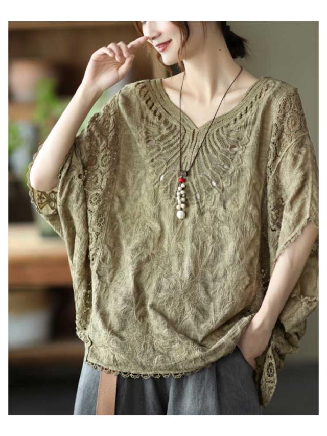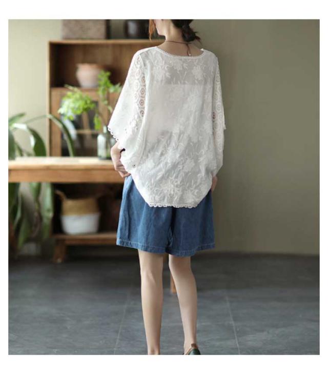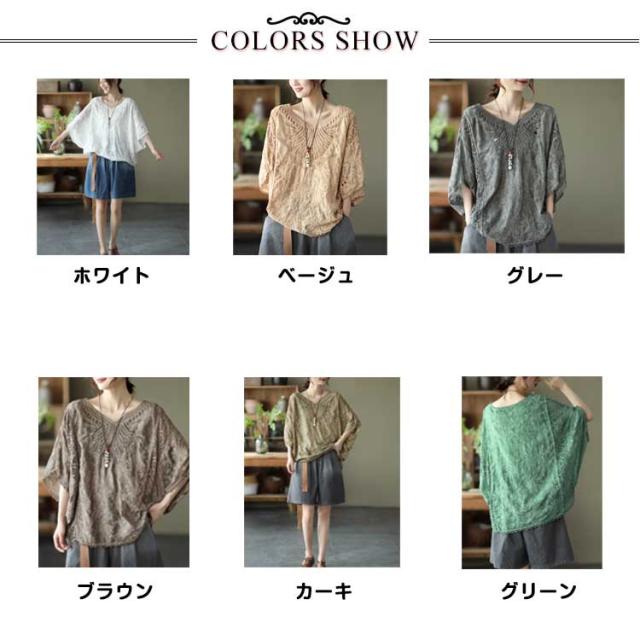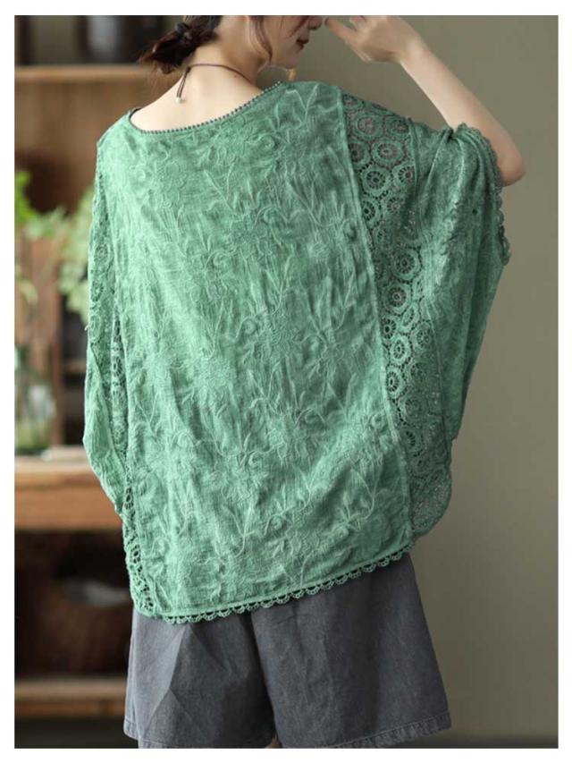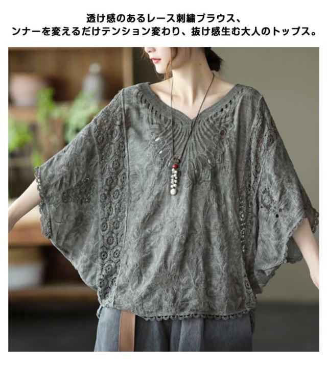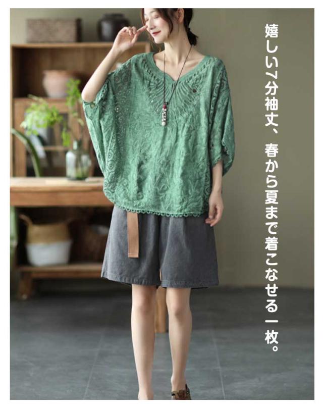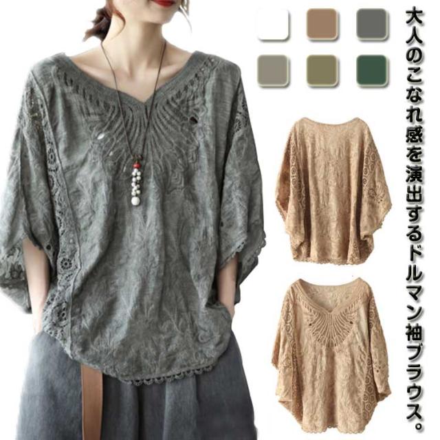 ゆったり 七分袖 ブラウス ドルマン コットン レディース 半袖 薄い ドルマンスリーブ 綿 レース レース刺繍 刺繍 ドルマントップス 送料無料 オーバーサイズ 大きいサイズ tシャツ 透け感 レース 涼しい 花柄 トップス