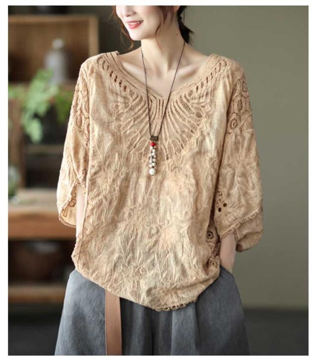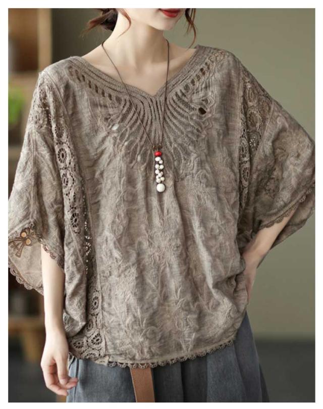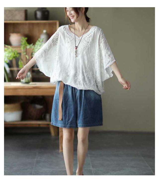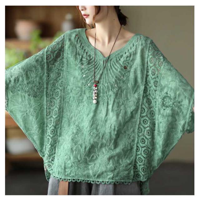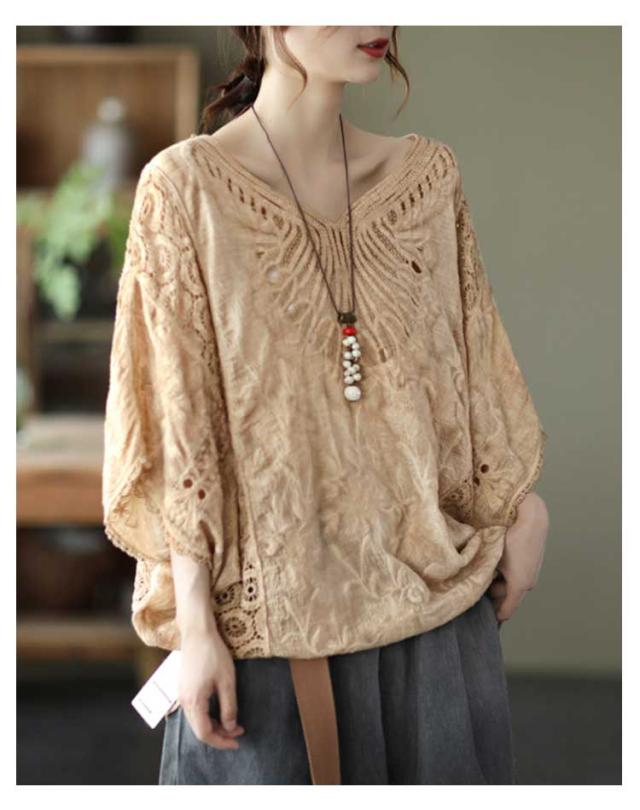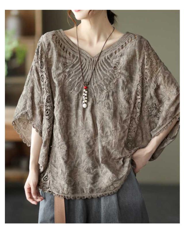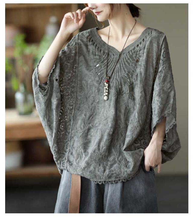 ゆったり 七分袖 ブラウス ドルマン コットン レディース 半袖 薄い ドルマンスリーブ 綿 レース レース刺繍 刺繍 ドルマントップス 送料無料 オーバーサイズ 大きいサイズ tシャツ 透け感 レース 涼しい 花柄 トップス