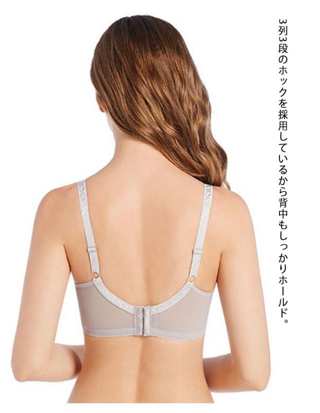 | 【バストの膨らみ、立体感を抑えた独自のカップ】より胸を小さく見せるようカップの膨らみは極限まで抑えつつ、自然で美しいバストラインを実現。胸を押し潰すだけじゃない独自設計だから、ストレスフリー。 ? 【伸縮性のあるレースではみ出る胸をしっかりホールド】フロント上部に伸縮性のあるゴムを入れ、視線が気になる谷間部分も高級感のあるラッセルストレッチレースでしっかりガード。さらに小胸に見えるよう設計しました。バスト全体をレースで覆っているので苦しくなりません。 ? 【脇高設計!Wのボーンで流れるお肉をしっかりキャッチ】脇高のWボーンでお肉が脇に流れるのを防ぎ、気になるはみ肉の凸凹もスッキリ綺麗に。より脇のほうまでワイヤーを伸ばすことで、脇肉を集めてシルエットをスッキリさせます。 ? 【太めのストラップでバストをキープ】肩への負担が少ない太めのストラップを採用。ストラップの付け根部分が幅広の三角形になっているので、胸のお肉が流れるのをせき止め、大きなバストをしっかり支えます。3列3段のホックを採用しているから背中もしっかりホールド。 ? 【カップとレースはあえて縫い付けない 汗がたまりにくいので着心地◎】カップとレースが分離しているので、胸同士がくっついてしまうことを最低限に抑え、胸元に汗がたまりにくい。カップがバストの形に添いやすく、綺麗にフィットします。 | |