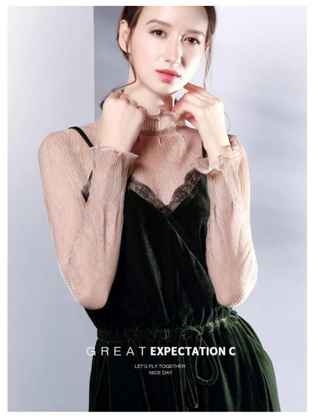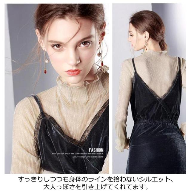 インナー シアー プリーツtシャツ 下着 レディース トップス シアートップス 長袖 ハイネック 透けトップス 肌着 重ね着 ラメ入り メロウフリル きれいめ レイヤードトップス 春 夏 S M L XL