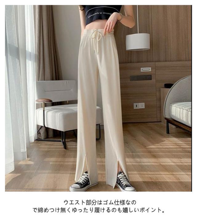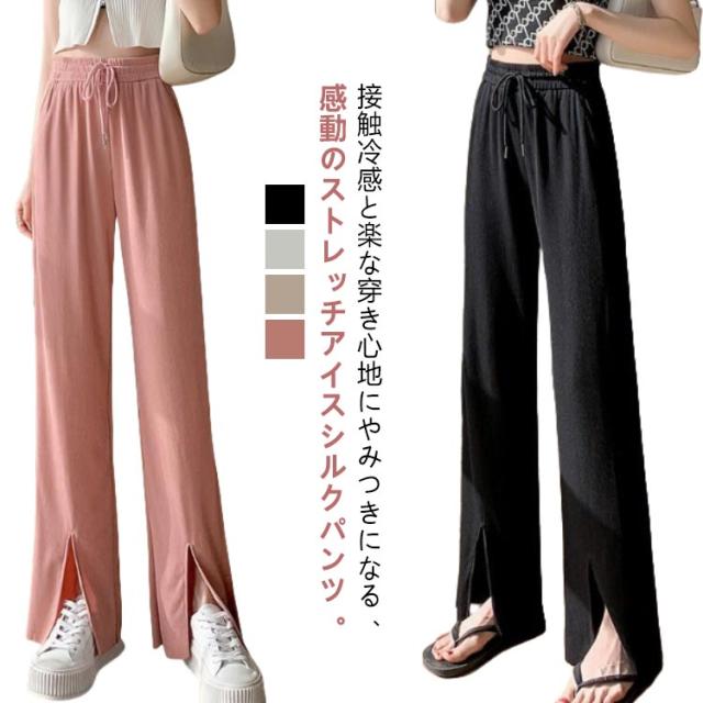 ボトムス 光沢感 春夏 パンツ イージーワイドパンツ 切れるパンツ ワイドパンツ ロングパンツ リブ レディース 体型カバー リラックス ウエストゴム プリーツパンツ 夏 カジュアル おしゃれ 薄手 伸縮性抜群 涼感 涼しい 部屋着 UVカット