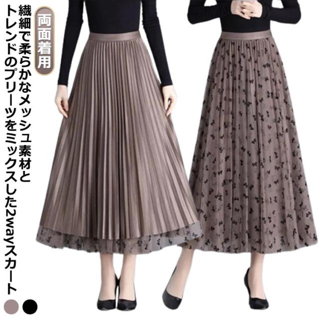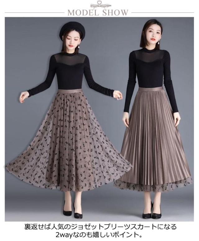 プリーツスカート レーススカート リバーシブル レース 無地 フレア ミモレ丈 スカート 花柄 レディース Aライン 裏地付き 春 夏 秋 ゴムウエスト 大人可愛い きれいめ 膝下 体型カバー おしゃれ ブラック コーヒー ホワイト