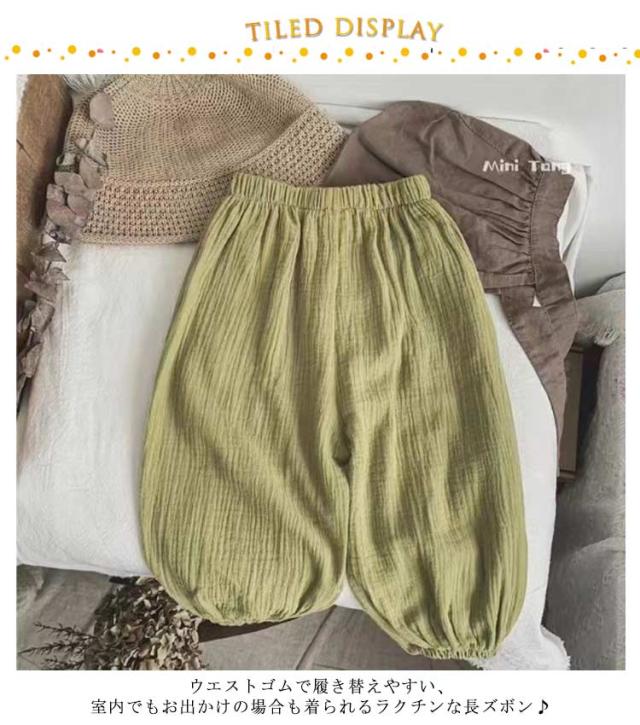 | 80-130cm!なめらかでさらりとした感触が心地よく、薄手で真夏でも涼しく穿ける。夏に嬉しいひんやりタッチが癖になる! ウエストゴムで履き替えやすい、室内でもお出かけの場合も着られるラクチンな長ズボン♪ 真夏でも涼しく履ける通気性の良い涼しい長ズボンです。半ズボンと違い、紫外線や蚊や怪我からも保護されます。薄手の生地で家でも外でも、保育園でもどこでも重宝します。 また、ウエスト部分はゴム仕様で、エアコンの冷房で就寝用のパジャマとしてもOK♪ | |