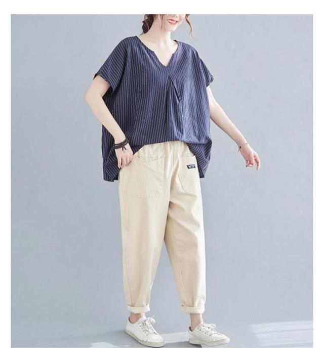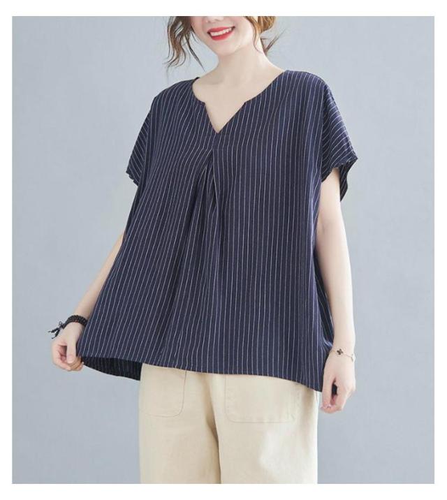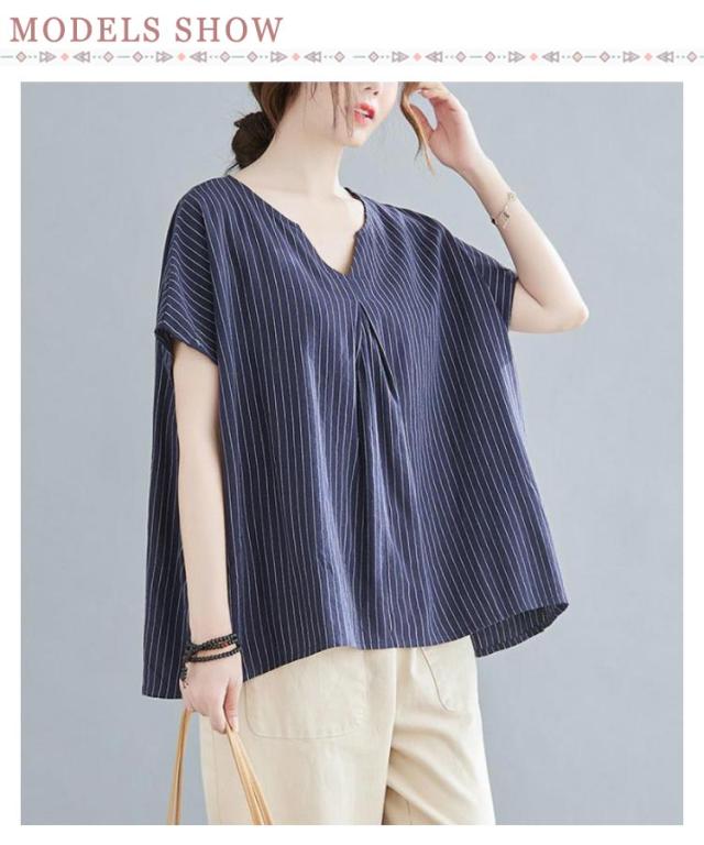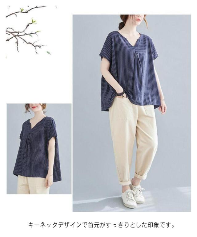 着やせ キーネック ブラウス 送料無料 半袖 シャツブラウス フレンチTブラウス フレンチ袖 ネイビー 体型カバー ストライプ柄 大人可愛い ゆったり Aライン レディース トップス タックブラウス 春 夏 フレアブラウス 大きいサイズ