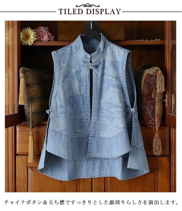 チャイナ風 チャイナボタン トップス ベスト ジレ ベスト レディース おしゃれ レディース ノースリーブ アウター デニム 前開き カジュアル S 30代 40代 50代 エスニック レトロ XL M L レイヤード