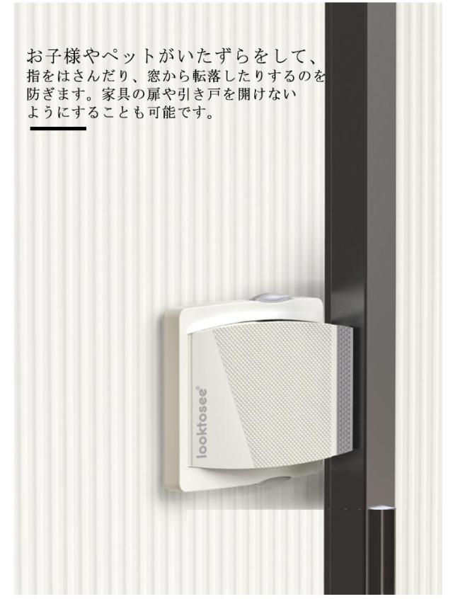 | 大事なお子さんを事故から守る。安全と安心の家庭用ドアロック。 お子様やペットがいたずらをして、指をはさんだり、窓から転落したりするのを防ぎます。家具の扉や引き戸を開けないようにすることも可能です。 ベランダ、台所、居間、バルコニーへの窓など、さまざまな引き戸にご利用いただけます。 赤ちゃんのけが防止、ペットの逃走や迷子を防ぎます。また空き巣や不法侵入の対策にもなります。 開け閉めも楽ちん!大人はボタンを押すだけで簡単にロックを解除できます。 お子様の身長では届かない所に設置してください。大事なお子様のためにより安心した住まいを作ることが可能です。 耐久性の強い両面テープを使用。超強力両面テープを使用。穴をあける必要もなく、設置する際の工具も不要です。はがしてもあとがつきづらく、きれいにとることができます。しっかりと窓に粘着するので、使い勝手がよりです。 家庭内でのさまざまなシーンで活躍!お風呂場の窓やベランダ、引き戸や引き窓、赤ちゃんのいるお部屋など、家庭内で様々な場面で安全を提供します。お子さまやペットのいるご家庭には欠かせないアイテムです。 | |