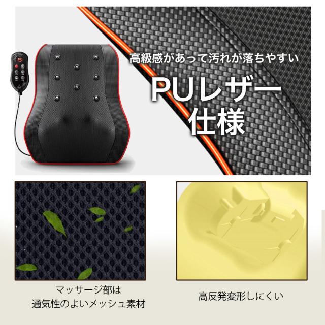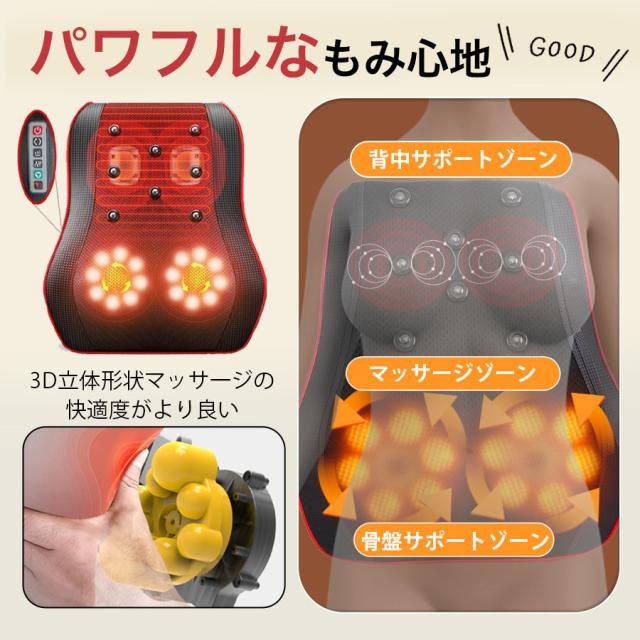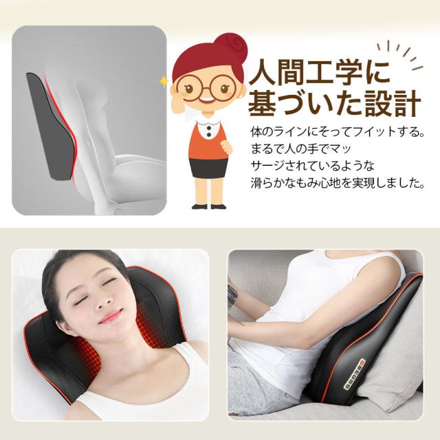 色々なシーンで活躍/三段階調節/ヒーター付/家庭・車載両用可能/コンパクト/簡単操作/3D揉み玉/人の手を模擬する/温熱機能/タイマー/人体工学設計/多機能/通気性良い/変形しにくい/日本語説明書付