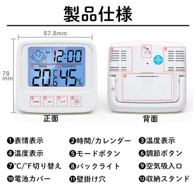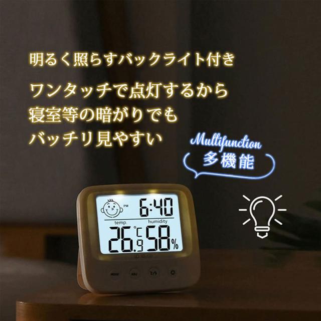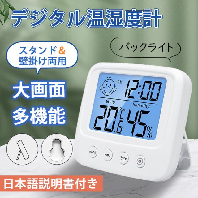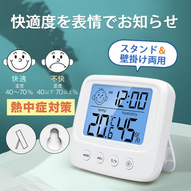 即納 温湿度計 温度計 湿度計 デジタル湿度計 目覚まし時計 バックライト付き コンパクト 表情表示 アラーム カレンダー 見やすい 健康管理 置き掛け兼用
