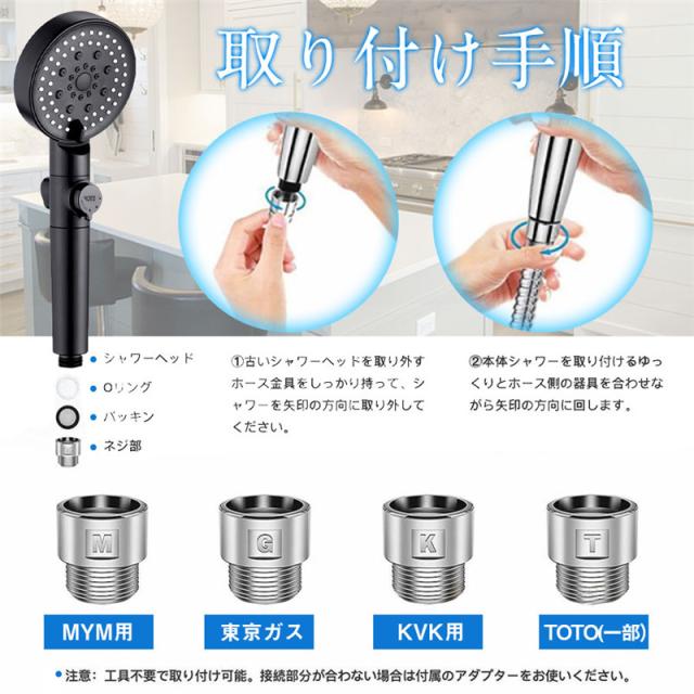 セット内容:シャワーヘッド本体、塩素除去フィルター(シャワーヘッド本体内に装着済み)、アダプター4種、接続用ゴムリング、日本語取扱説明書