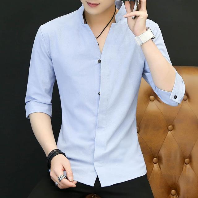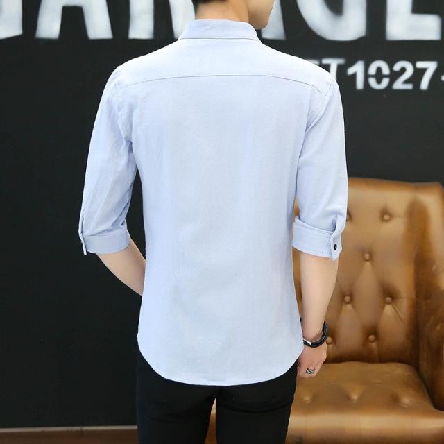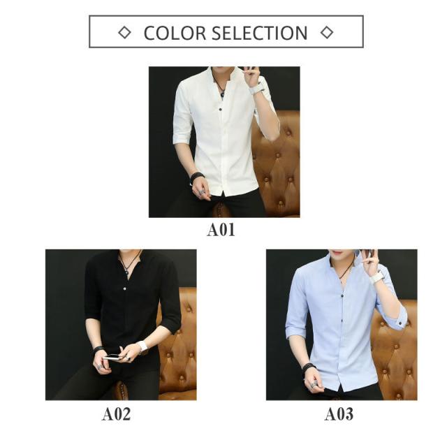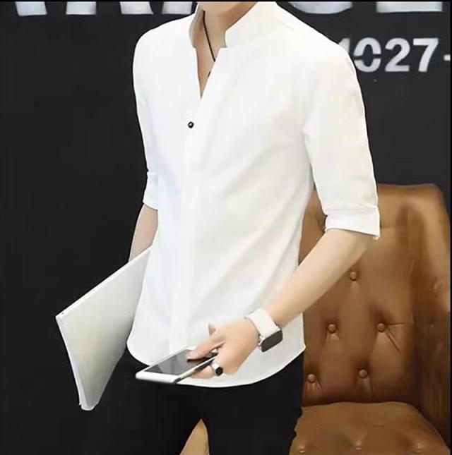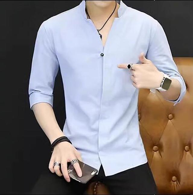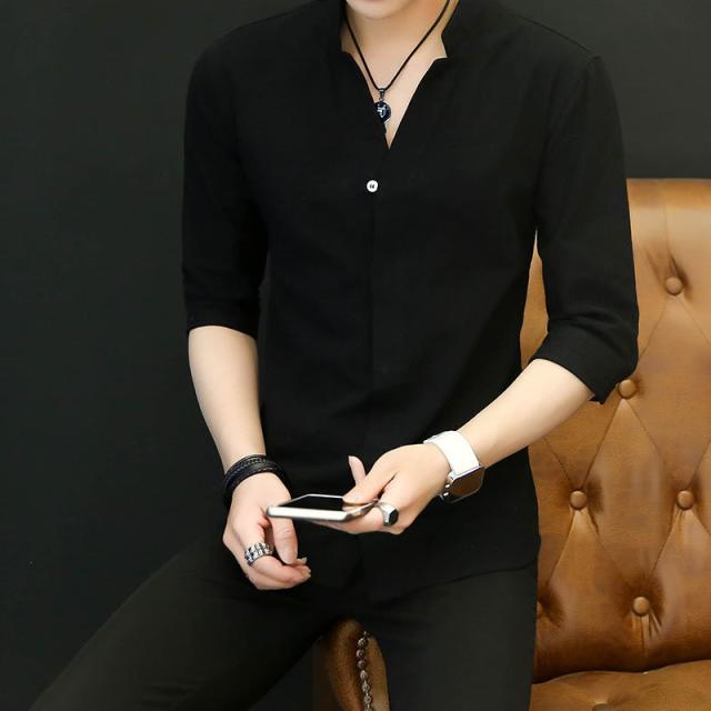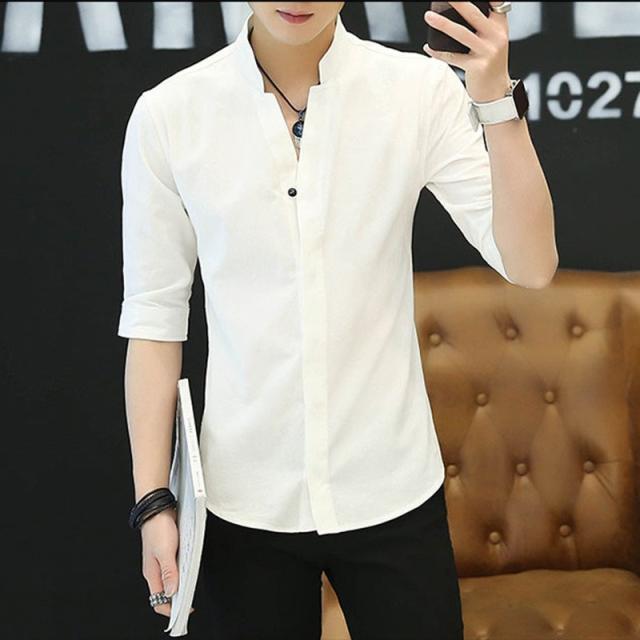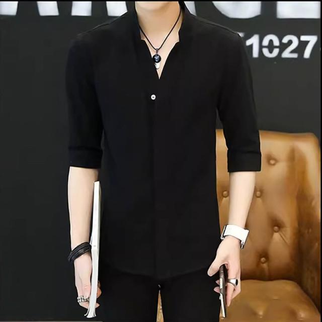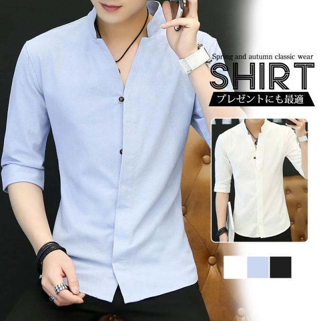 七分袖シャツ メンズ 無地 開襟シャツ 半袖 カジュアルシャツ 立て襟 コットン 綿 トップス 父の日 通勤 通学 体型カバー お出かけ おしゃれ