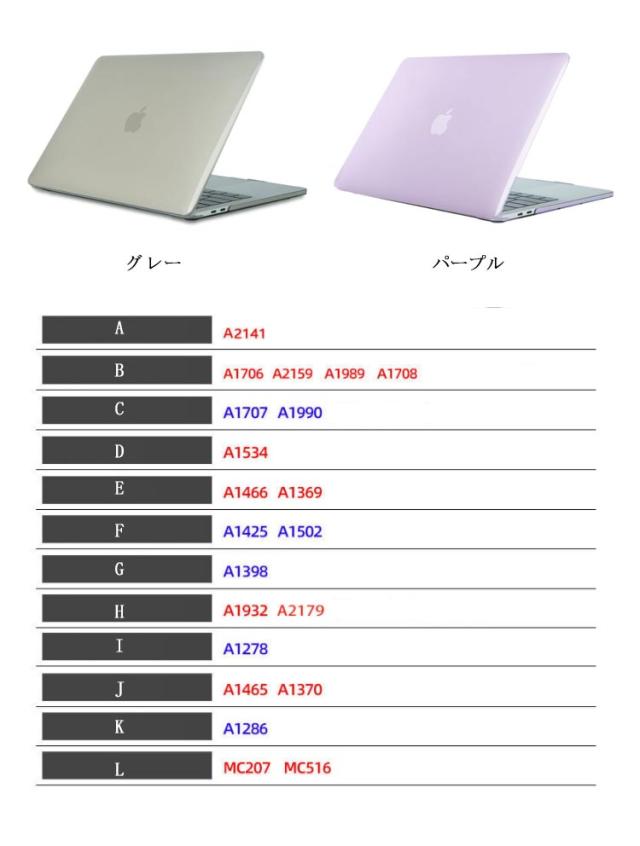 | 【商品名】 MacBook用保護ケース 【サイズ】サイズ表 【素材】 PC素材 【特徴】MacBook本体を傷や汚れから守るハードケース。傷に強い丈夫なPC素材を使用。取り付け・取り外しが簡単です。 | |