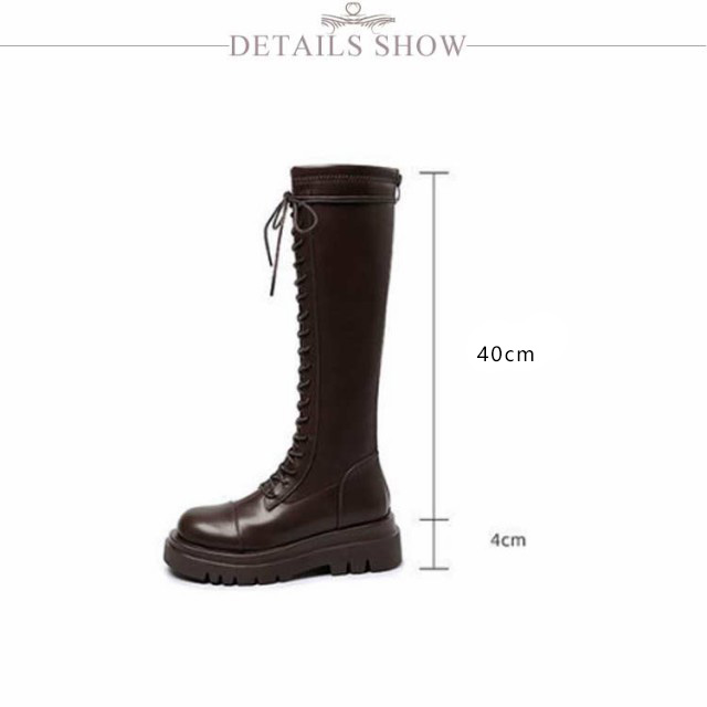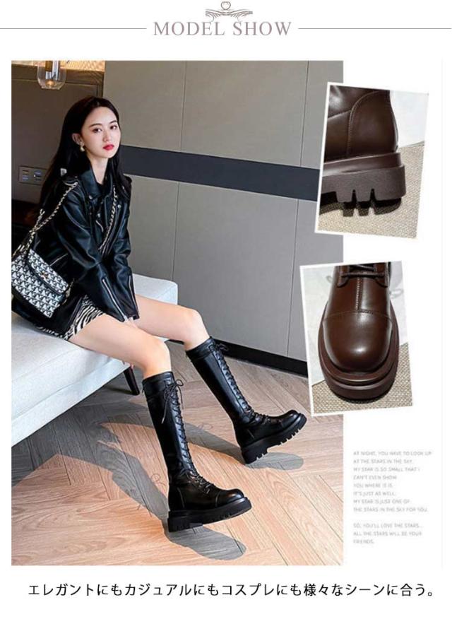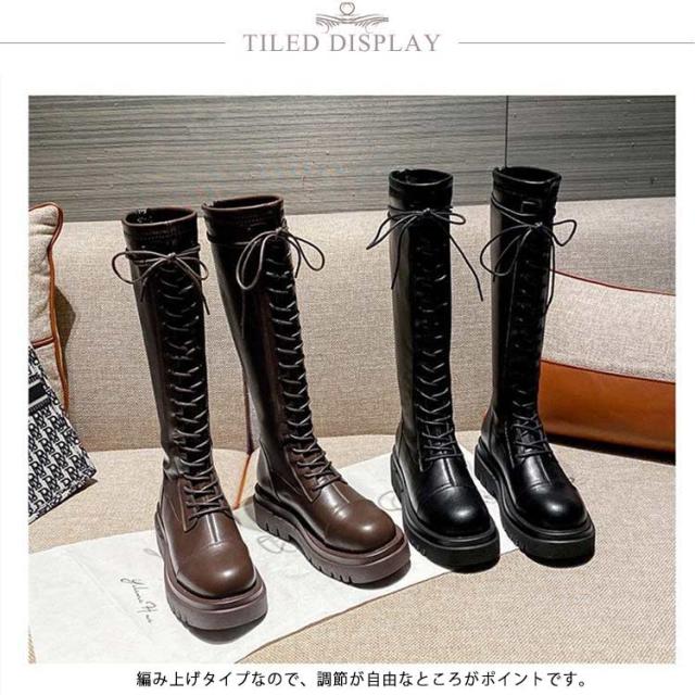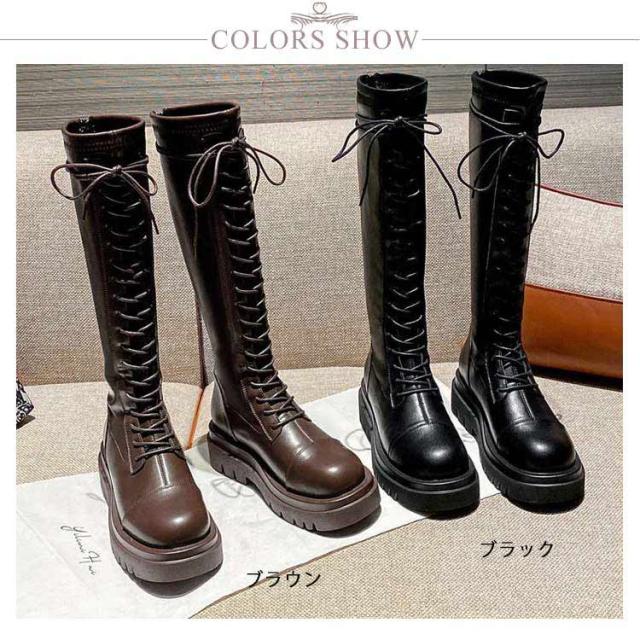 ロングブーツ レディース 編み上げ 厚底 ブーツ ファッション クラシック レースアップ 膝丈 ジョッキーブーツ 歩きやすい 美脚 防寒 ラウンドトゥ シンプル 春 秋 冬 ブラック ブラウン