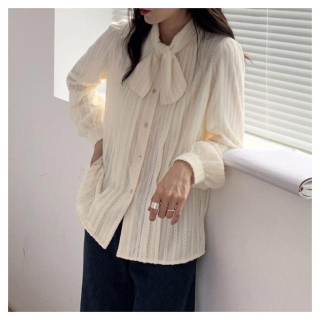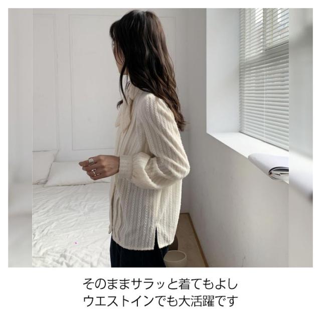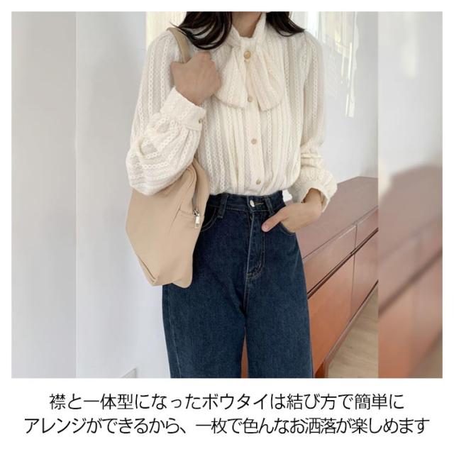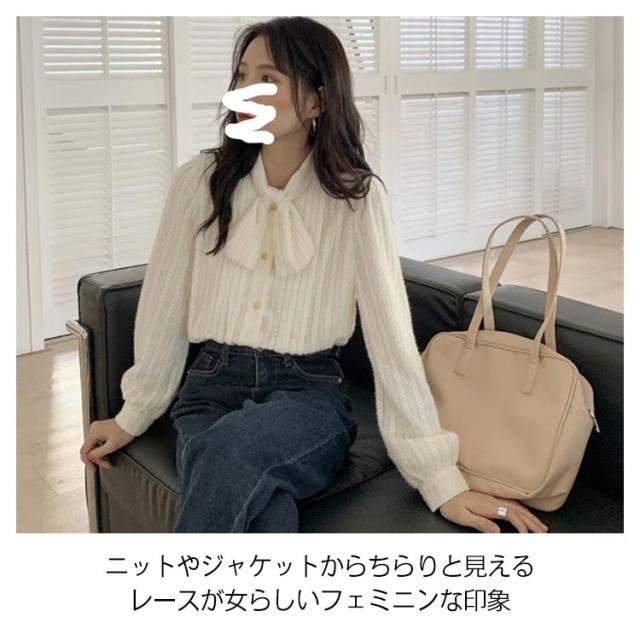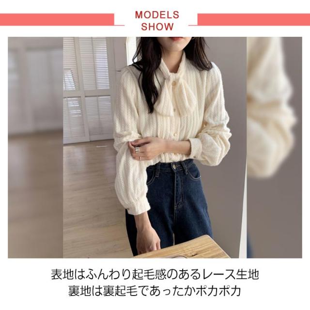 | 大きめの可愛いボウタイが特徴的な裏起毛シャツブラウス。 表地はふんわり起毛感のあるレース生地、裏地は裏起毛であったかポカポカ。 襟と一体型になったボウタイは結び方で簡単にアレンジができるから、一枚で色んなお洒落が楽しめます。 袖のぽわんシルエットにもこだわり、袖をまくってもおろしても綺麗なフォルムになるようにこだりました。 ニットやジャケットからちらりと見えるレースが女らしいフェミニンな印象。 薄手タイプも用意しておりますので長い季節着まわしやすい。 そのままサラッと着てもよし、ウエストインでも大活躍です。 | |