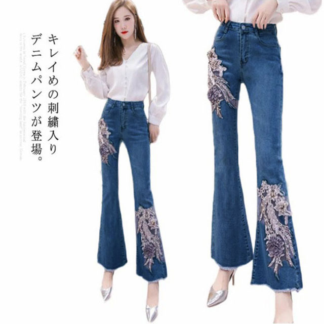 フラワーモチーフ刺繍がアクセントを添えて。デニムパンツ スキニージーンズ スキニーデニム レディース ジーンズ デニム スキニー ボトムス ハイウエスト 刺繍 おしゃれ