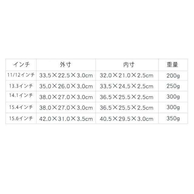| サイズについての説明 | 11/12インチ 13.3インチ 14.1インチ 15.4インチ 15.6インチ |