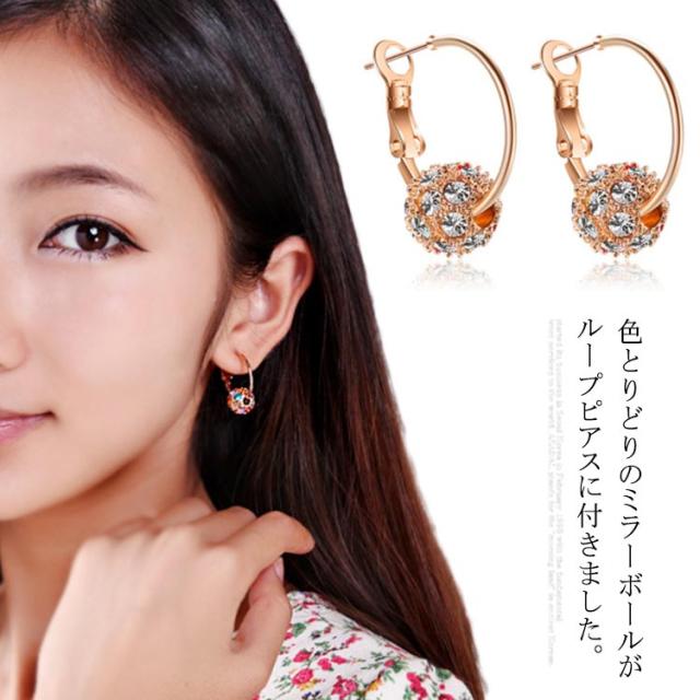 | 色とりどりのミラーボールがループピアスに付きました。 くるくると可愛く動きます。 おしゃれなあなたに付けてもらいたい逸品です。 金属アレルギーの方でも安心して身につけていただけます。 普段使いはもちろん、オフィスから結婚式の披露宴や二次会、ちょっとしたお呼ばれの場など多くのシーンで大活躍すること間違いなし。 | |