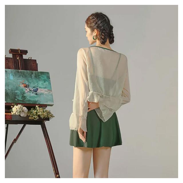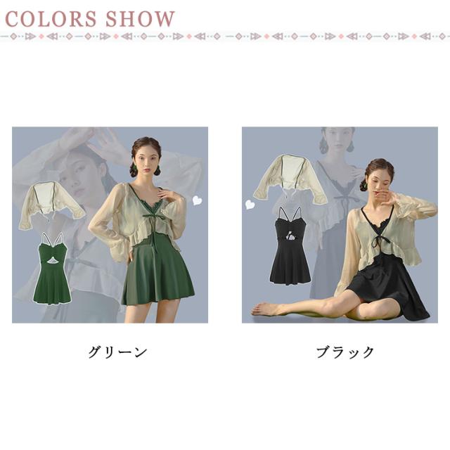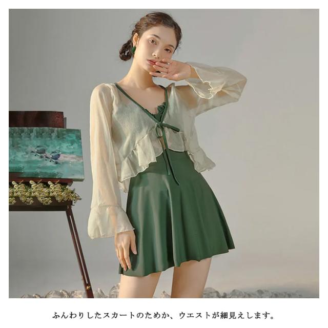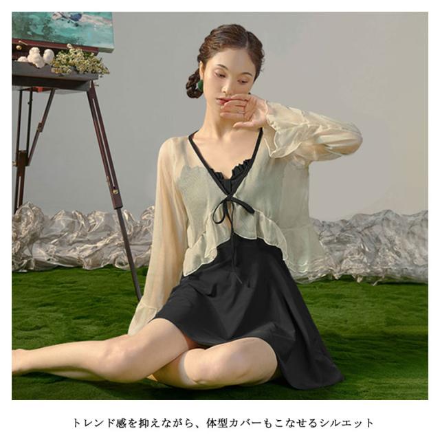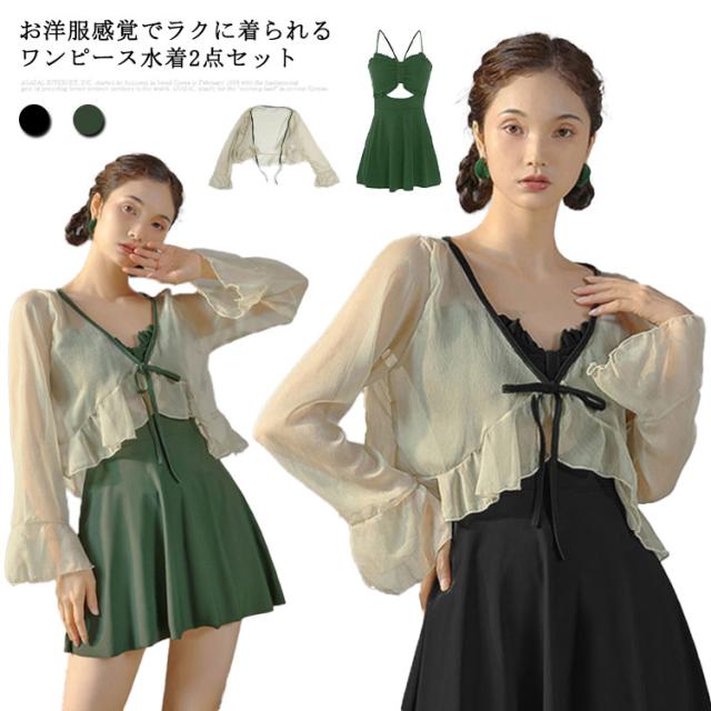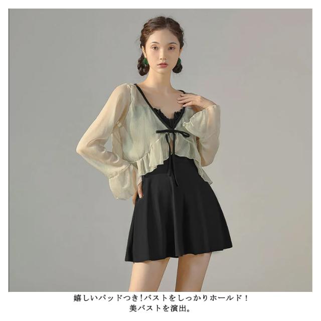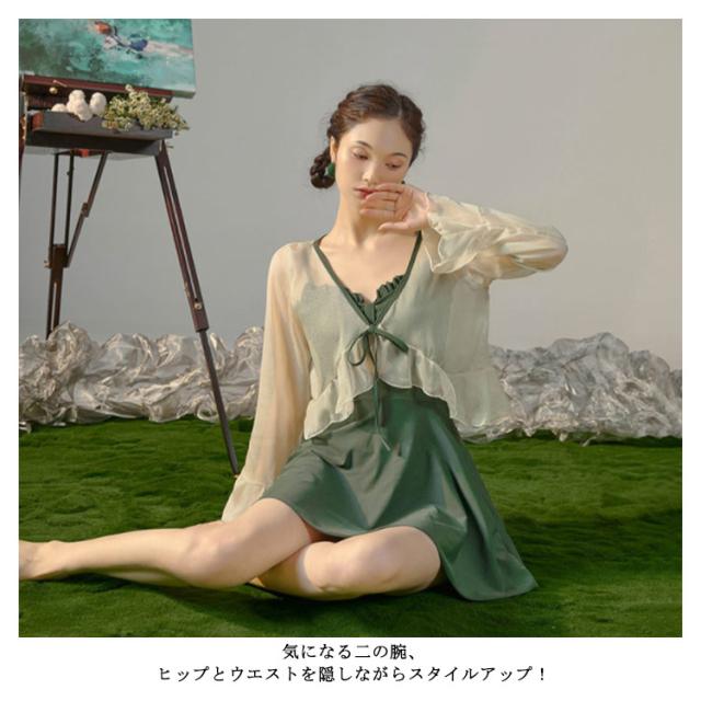 水着 ワンピース 体型カバー 2点セット レディース カーディガン タンキニ フレア 露出控えめ ママ 水着 S M L XL 大人可愛い 胸パッド付き 温泉 海水浴 水泳 ビーチウェア 小胸 着痩せ 送料無料