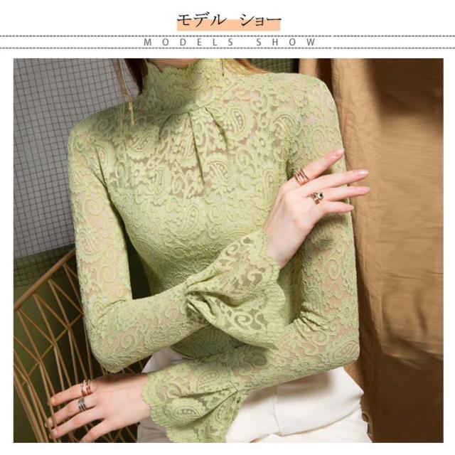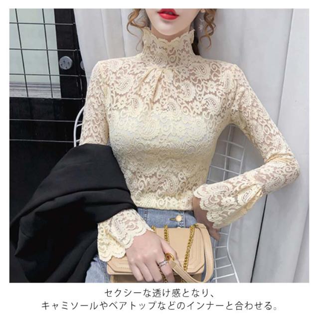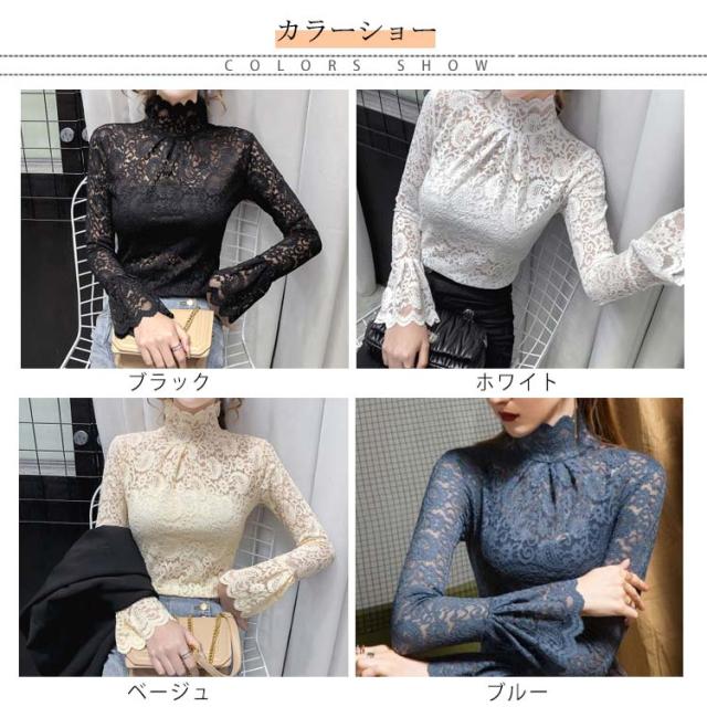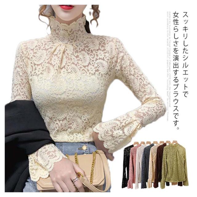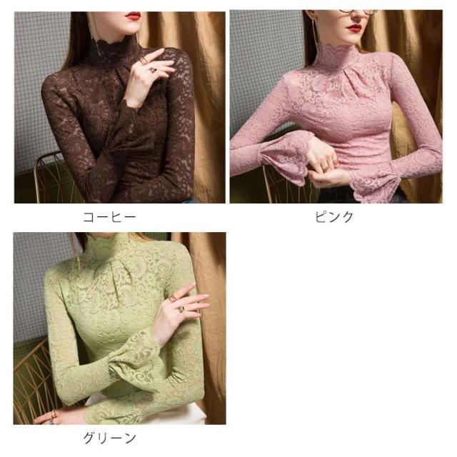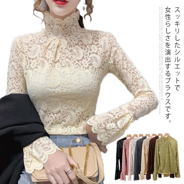 ブラウス 総レース 長袖 レディース トップス ハイネック インナー プルオーバー オフィス 通勤 体型カバー キレイめ お洒落 シンプル 透け感 春秋 フレア袖